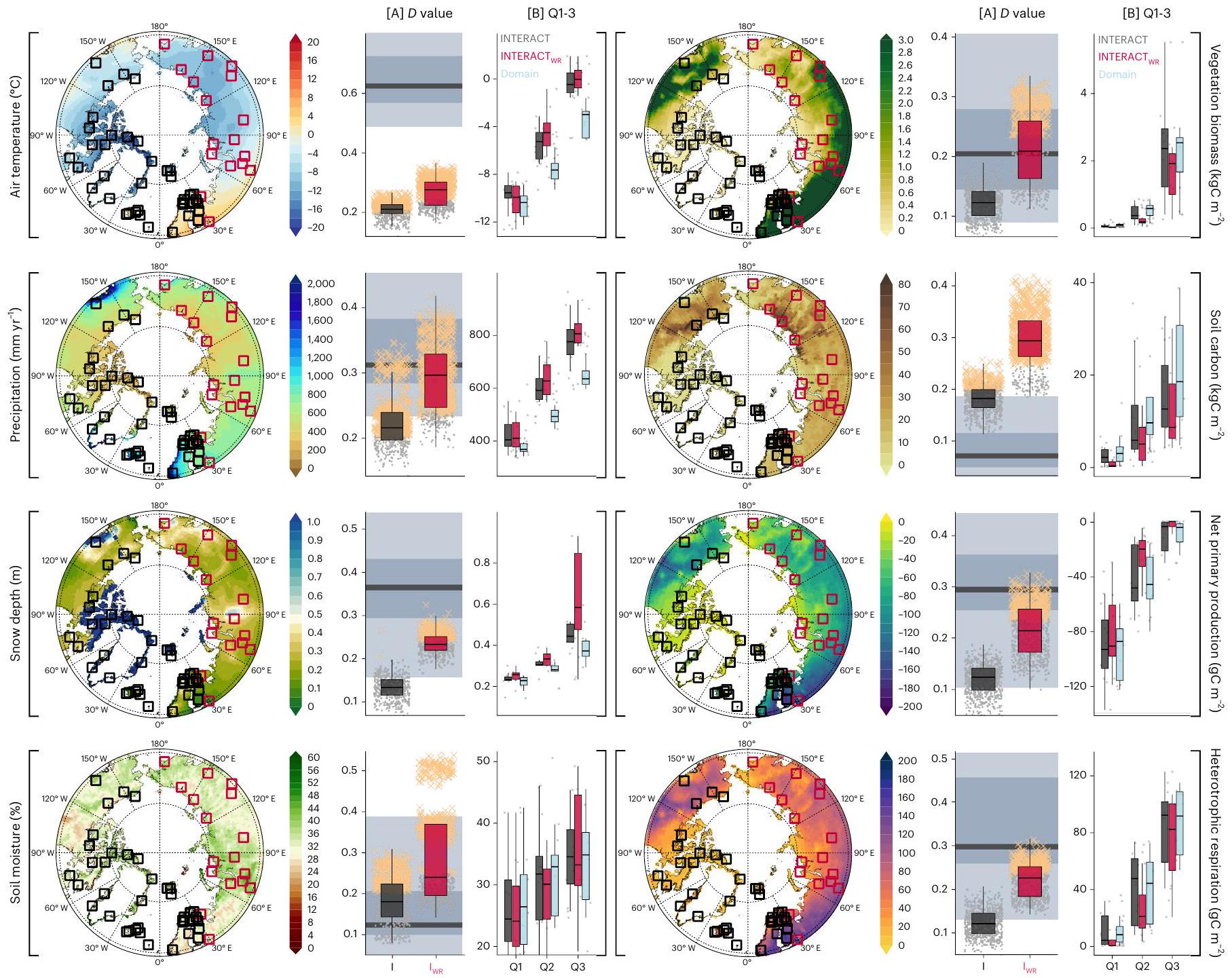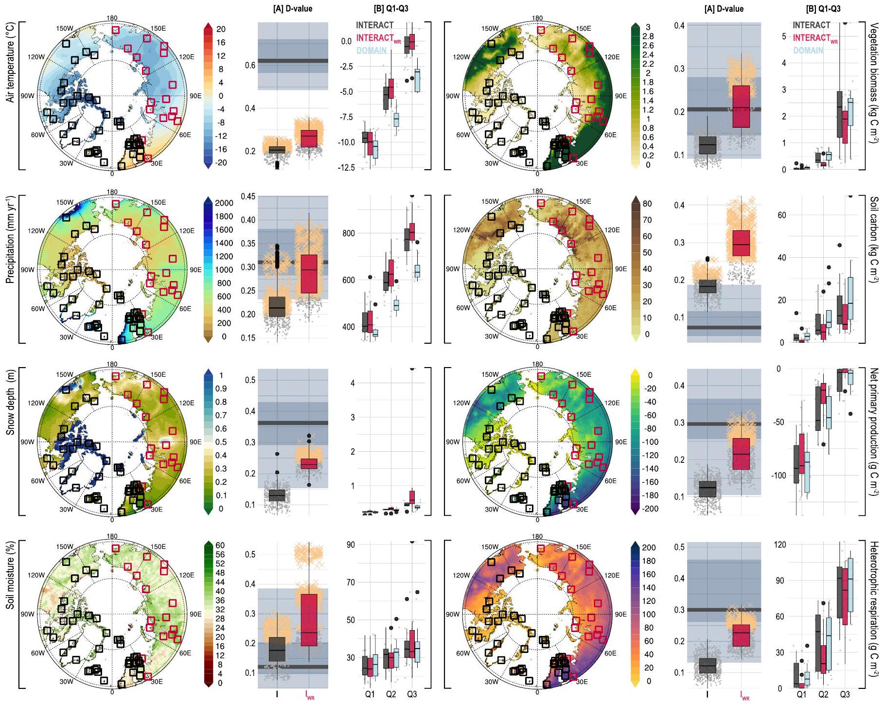 Fig. 1| Shifts in representativeness. The effects of excluding Russian research stations (red boxes on the maps) from the INTERACT network with respect to eight ecosystem variables (air temperature, total precipitation, snow depth, soil moisture, vegetation biomass, soil carbon, net primary productivity and heterotrophic respiration). Maps visualize contemporary conditions above . For each variable, the potential biases of INTERACT with respect to the conditions in the pan-Arctic domain are depicted by two sets of box plots: [A] and . shows the maximum deviation ( values) between two cumulative distribution functions (INTERACT with (I) or without ( ) Russian stations) versus the contemporary pan-Arctic domain. The maximum deviation between the contemporary versus end-of-the-century pan-Arctic domain is shown by the