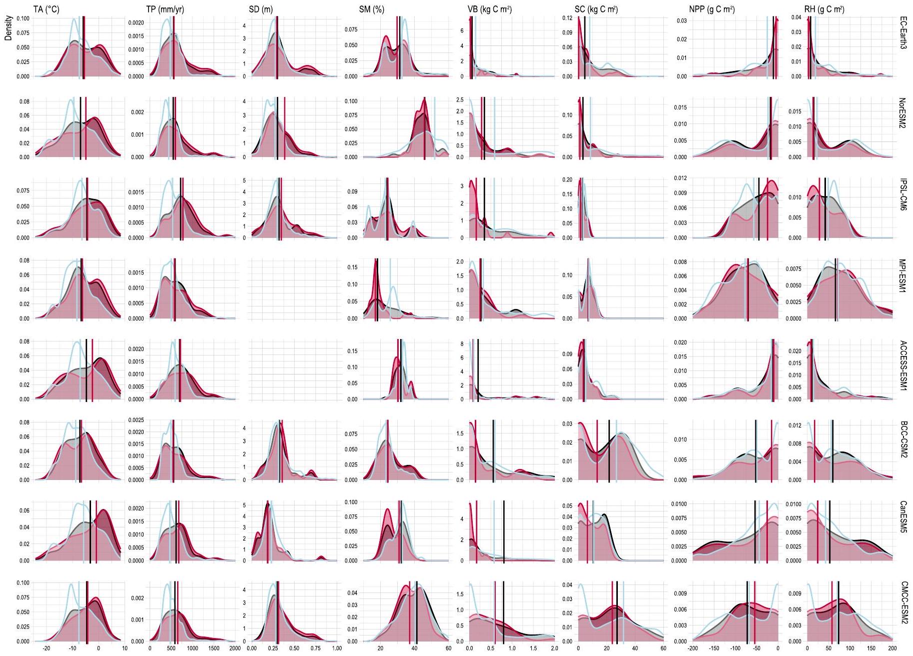 Extended Data Fig. 2 | Density distribution functions for the ecosystem variables (air temperature, TA; total precipitation, TP; snow depth, SD; soil moisture, SM; vegetation biomass, VB; soil carbon, SC net primary production, NPP; and heterotrophic respiration, RH ) for each of the CMIP6 ESMs comparing the ecosystem conditions at the INTERACT stations with (black) and without (red)