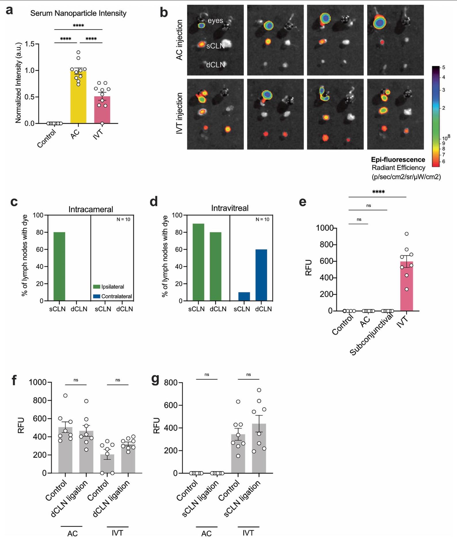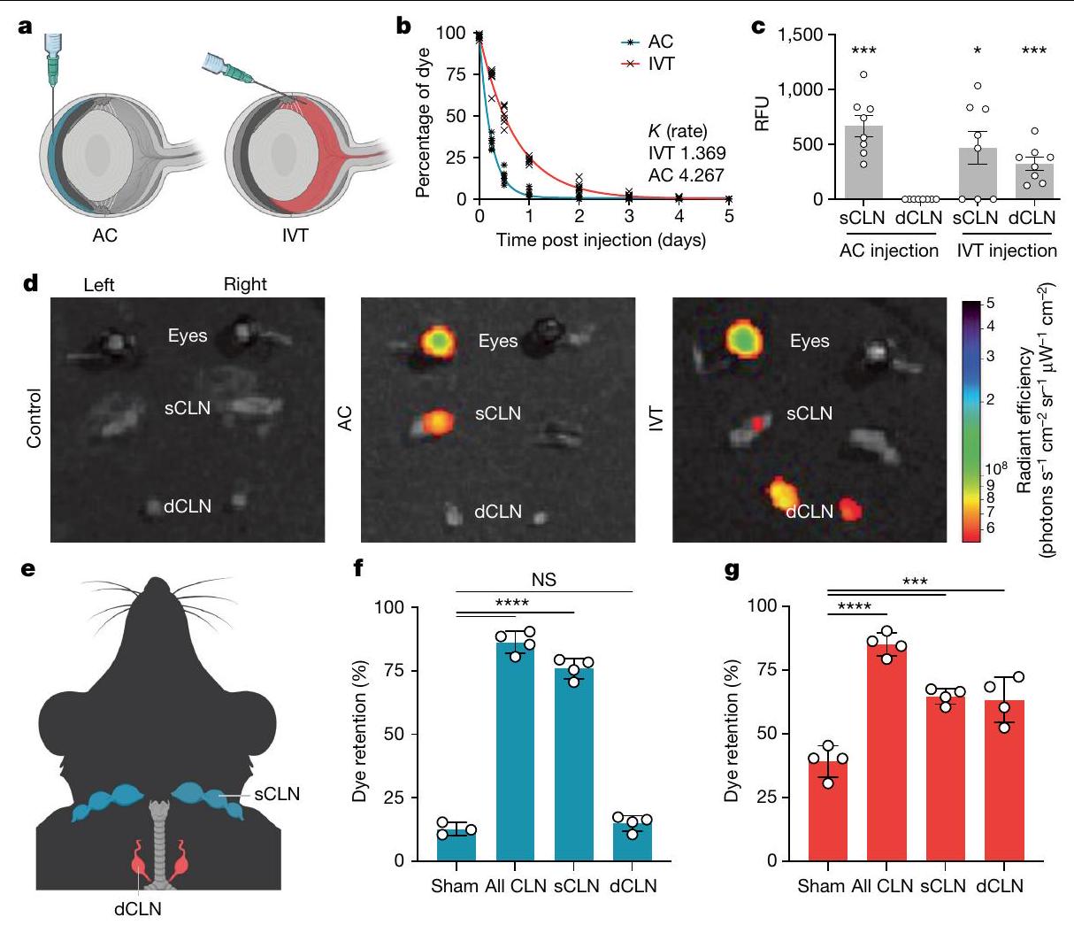 لتحقيق في أنظمة الصرف المختلفة للأقسام الأمامية والخلفية من العين، قمنا بحقن الدكسترانات المعلمة بالفلوريسنت عبر طرق AC أو IVT وقمنا بت quantifying حركيات احتفاظ الدكستران (الشكل 2a). كانت معدل إزالة الدكستران من العين بعد الإدارة عبر IVT (كان أبطأ بشكل ملحوظ من ذلك بعد إدارة AC“; الشكل 2ب). تم اختبار الدكسترانات بأطوال موجية مختلفة من الفلورية وأوزان جزيئية مختلفة للتأكد من أن هذه الظاهرة ليست محددة بصبغة معينة. افترضنا أن هذه الملاحظة يمكن تفسيرها بإمكانية واحدة من اثنتين؛ إما أن تكون للأقسام طرق تصريف فريدة، أو أن الخطوة المحددة لمعدل تصريف كل قسم مختلفة (أي أن الانتشار عبر الزجاجي قد يكون أبطأ خطوة). افترضنا أن هذه التفسيرات المحتملة يمكن توضيحها من خلال مراقبة توطين الصبغة في الجسم الحي. باستخدام طريقة تم وصفها سابقًاأكدنا أنه يمكن الكشف عن الصبغة التي تم حقنها في الحجرة الأمامية (AC) وحقنها داخل الجسم الزجاجي (IVT) في المصل. ومع ذلك، تم الكشف عن تركيزات أعلى بكثير من الصبغة في الدم بعد حقن AC مقارنةً بعد حقن IVT (الشكل 3a من البيانات الموسعة). بينما كانت الصبغة التي تم حقنها في AC محصورة في العقد اللمفاوية السطحية الجانبية المقابلة، كما تم الإبلاغ عنه سابقًا.صبغة تم حقنها عن طريق IVT تم تحديدها في العقد اللمفاوية الدرقية الثنائية بالإضافة إلى العقد اللمفاوية السفلية من نفس الجانب