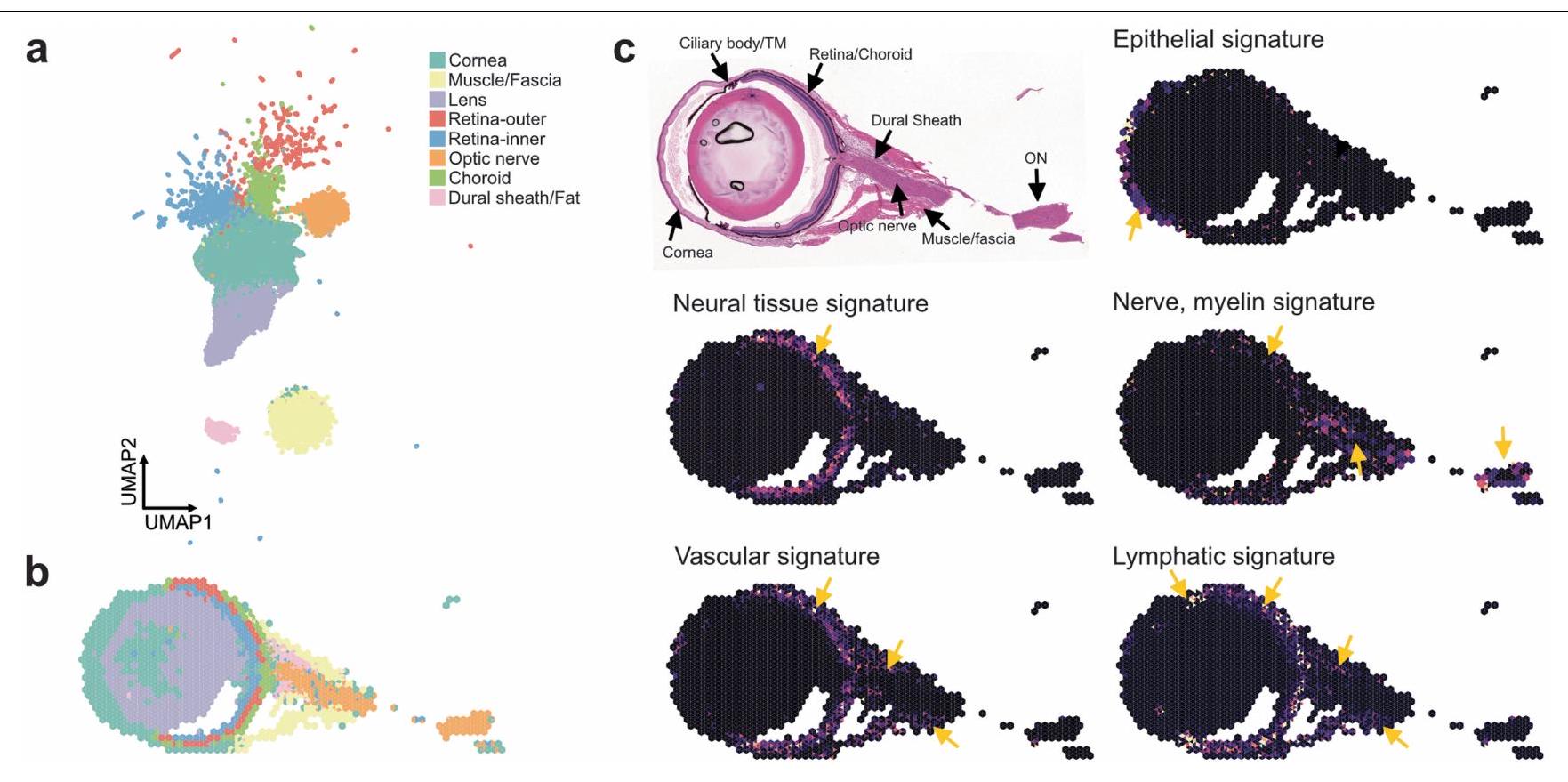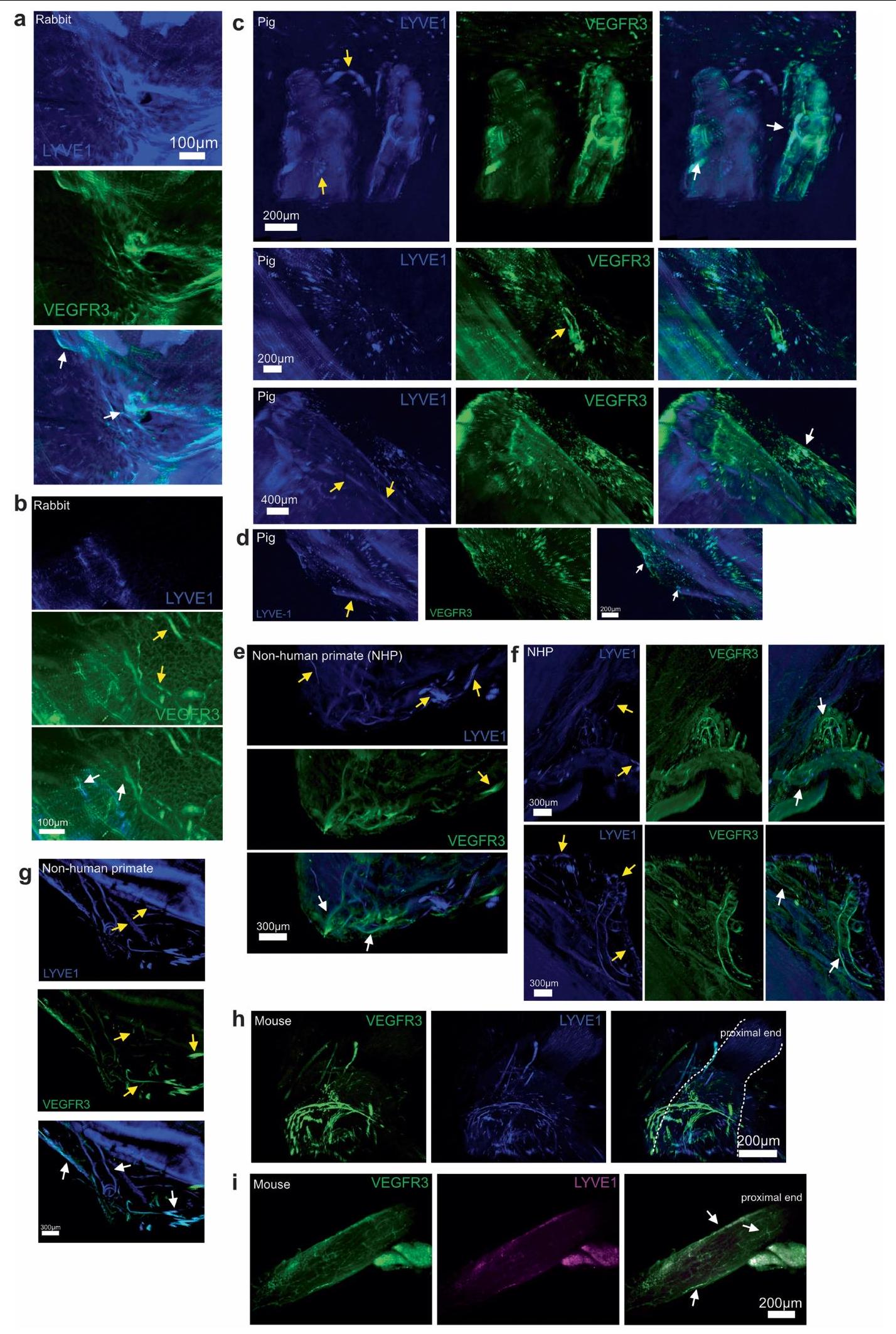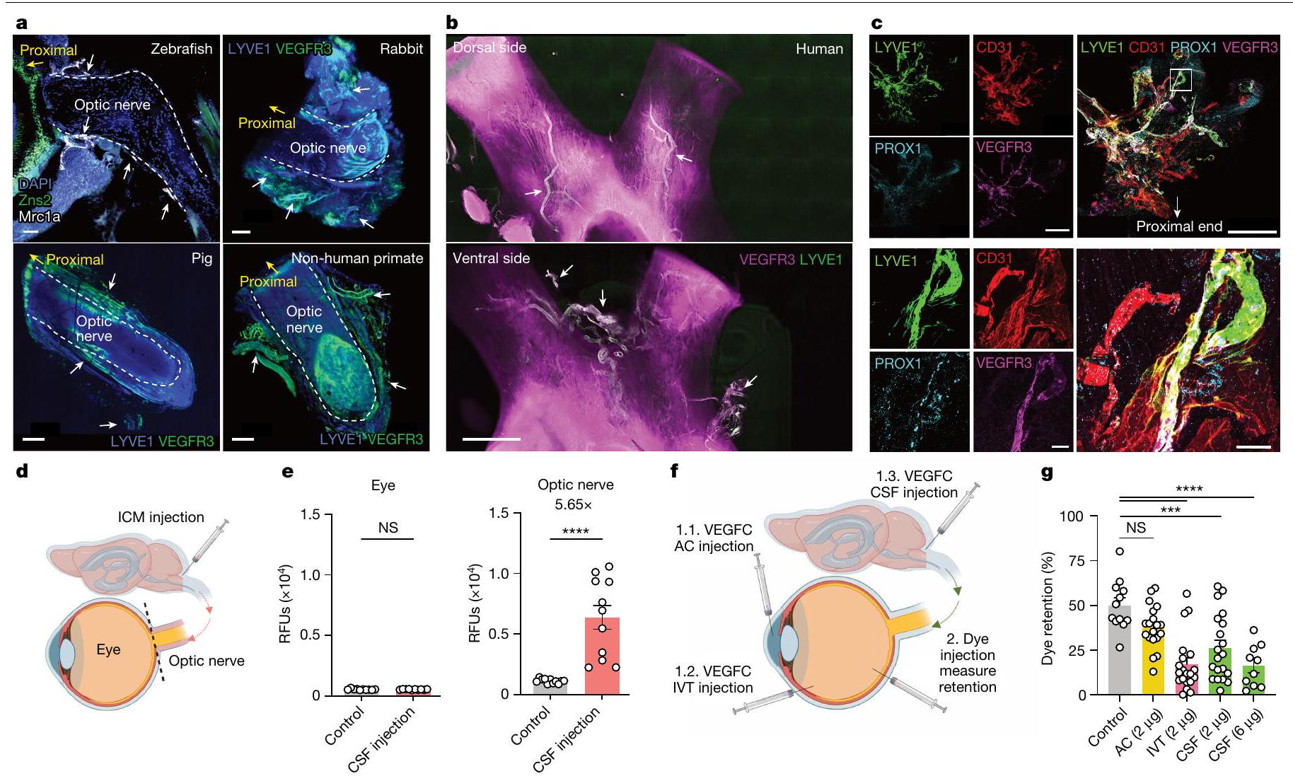 تشير موضع الجزيئات الكبيرة في العقد اللمفاوية المتميزة إلى أن شبكة الأوعية اللمفاوية ربما تكون وسيلة لتصريف كل من هذه الأقسام. على الرغم من أن دراسة حديثة وصفت وجود نظام غليمفاتي عيني في الفئران، مشابه لذلك الموجود في الدماغ.لم يتم حل شبكة وظيفية من الأوعية اللمفاوية التي تتوسط تصريف الزجاجي. لذلك، استخدمنا نهجًا ترنسكريبتوميًا جنبًا إلى جنب مع التصوير ثلاثي الأبعاد المدعوم بتوسيم المناعية للأعضاء المنظفة بالمذيب (iDISCO).للحصول على رؤية شاملة لشبكة الأوعية اللمفاوية المرتبطة بالعصب البصري في أنواع الفقاريات المختلفة. ساعدت تقنيات النسخ الجيني المكاني في جمع رؤية على مستوى العضو لتوقيعات جينات الأوعية اللمفاوية الشبيهة في العين والعصب البصري. بالإضافة إلى الشبكة التربيقية.والشبكية، التي وُجد أنها تحتوي على البلعميات التي تعبر عن بعض توقيعات الجينات الشبيهة باللمفاويةوجدنا أن غمد العصب البصري يحتوي أيضًا على توقيعات جينية تشبه الأوعية اللمفاوية (الشكل التمديدي 4). بالتوازي، كشفت تقنية iDISCO عن وجود أوعية لمفاوية تغطي أعصاب البصر في الأسماك الزعنفية، والفئران، والأرانب، والخنازير، والرئيسيات غير البشرية، والبشر (الشكل 3 أ، ب والشكل التمديدي 5)، مما يدل على سمة محفوظة تطوريًا للجهاز اللمفاوي. في جميع الثدييات، رأينا هياكل وعائية مع تلوين متزامن لـ LYVE1 ومستقبل عامل نمو بطانة الأوعية الدموية 3 (VEGFR3؛ الأسهم البيضاء في الشكل التمديدي 5). كما رأينا أوعية دموية ملونة لأحدهما وليس الآخر، مما يشير إلى احتمال وجود أوعية لمفاوية جمع سلبية لـ LYVE1.أو البلعميات التي تعبر عن LYVE1 (الأسهم الصفراء في الشكل 5 من البيانات الموسعة). ومن الجدير بالذكر أن الأوعية اللمفاوية كانت محصورة في الأغشية المحيطة بالعصب، وليس في العصب نفسه، بما يتماشى مع ما يُلاحظ في الدماغ والأغشية السحائية الجافية..