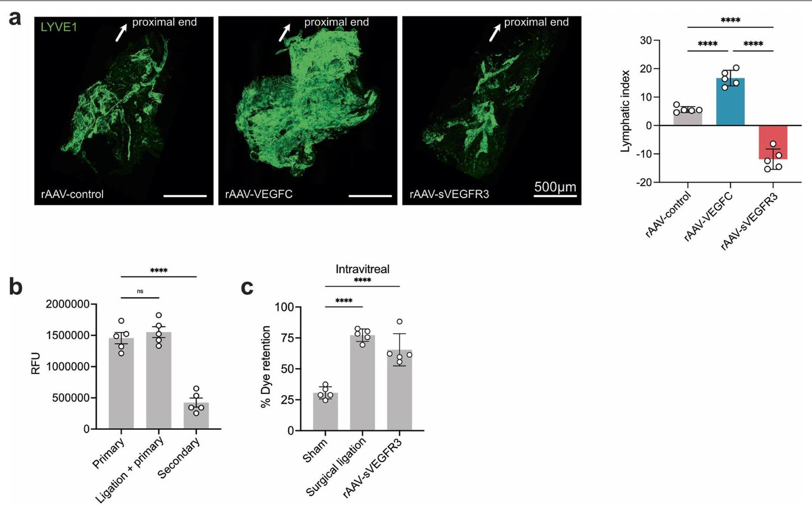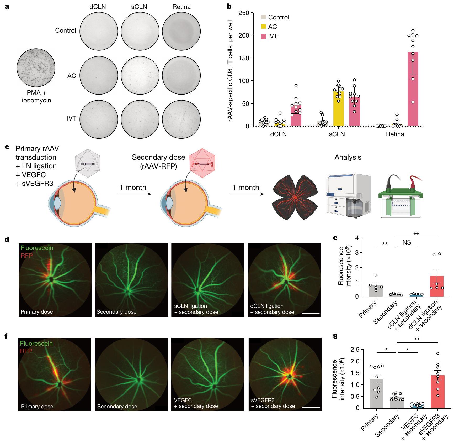 بعد تأكيد الأهمية المناعية لهذا التصريف العيني الخلفي، قمنا بعد ذلك بالتحقيق في التطبيقات العلاجية المحتملة التي تستفيد من هذه النتيجة. تعتبر الفيروسات المعاد هندستها (rAAVs) الأكثر شيوعًا كوسائط توصيل الجينات في الجسم بسبب قدرتها على النقل بشكل آمن وفعال.. بالإضافة إلى ذلك، كان استخدام AAV2 كناقل لعلاج المرضى الذين يعانون من ضمور الشبكية الوراثي المرتبط بـ RPE65 هو أول علاج جيني تم الموافقة عليه من قبل إدارة الغذاء والدواء الأمريكية. ومع ذلك، على الرغم من خصائصه المناعية المعدلة، فإن المناعة المكتسبة ضد rAAV تحد من فعالية إدارته المتكررة. قمنا أولاً بتوصيف CD8 المحدد لـ rAAVتحفيز خلايا T في العقد اللمفاوية والشبكية بعد إعطاء الرAAV عن طريق الحقن داخل الجسم الزجاجي والحقن تحت الجلد باستخدام اختبار ELISpot. على الرغم من أن كل من الحقن تحت الجلد والحقن داخل الجسم الزجاجي أدى إلى تحفيز كمية مماثلة من خلايا CD8 الخاصة بالرAAV.الخلايا التائية في العقد اللمفاوية السطحية، حقن IVT أدى بشكل خاص إلى تحفيز المزيد من خلايا CD8 المحددة لـ rAAVالخلايا التائية في العقد اللمفاوية الدرقية والشبكية، التي لم تُلاحظ بعد حقن AC (الشكل 4 أ، ب). وقد استنتجنا أن تصريف اللمف على يساهم العصب البصري في الاستجابة المناعية لـ rAAV، خاصةً بالنسبة للنهج العلاجي القائم على الشبكية، مما يحد من فائدته. قمنا بدراسة ما إذا كان استئصال الأوعية اللمفاوية العينية يمكن أن يمكّن من فعالية علاجية مطولة بعد حقن rAAV المتكرر في العين. لاختبار ذلك، قمنا أولاً بإعطاء الجرعة الأولية من rAAV، وبعد شهر، أعطينا جرعة ثانية من rAAV المعبر عن RFP (rAAV-RFP). كتحكم أساسي، تم إعطاء الفئران السليمة rAAV-RFP في وقت الجرعة الثانية (الشكل 4c). مشابهًا للنتائج التي توصلت إليها التقارير السابقة ومتسقًا مع ملاحظتنا بشأن المناعة المحلية في الجهاز العصبي المركزي، كان مستوى تعبير RFP بعد العدوى الثانوية أقل بكثير من ذلك بعد العدوى الأولية (الشكل 4d، e). تم تأكيد أهمية الأوعية اللمفاوية العينية من خلال إجراء تجربة مماثلة بعد ربط sCLN أو dCLN، والتي أظهرت أن ربط dCLN فقط كان كافيًا في تخفيف الاستجابة المناعية لـ rAAV واستعادة كفاءة نقل rAAV-RFP الثانوي (الشكل 4d، e). بالإضافة إلى ذلك، أكدنا أن إجراء الربط لم يؤثر على التحدي الأولي (الشكل 9b من البيانات الموسعة). نظرًا لأن ربط العقد اللمفاوية جراحيًا لن يكون خيارًا علاجيًا قابلاً للتطبيق، استخدمنا طريقة بديلة لتثبيط النشاط الجزيئي للأوعية اللمفاوية: الإدارة الوريدية لـ sVEGFR3، والتي وجدنا أنها تثبط تصريف اللمف بنفس القدر تقريبًا مثل الربط الجراحي (الشكل 9c من البيانات الموسعة). رأينا أن الاستجابة المناعية لـ rAAV تفاقمت أكثر بوجود VEGFC، والذي هو