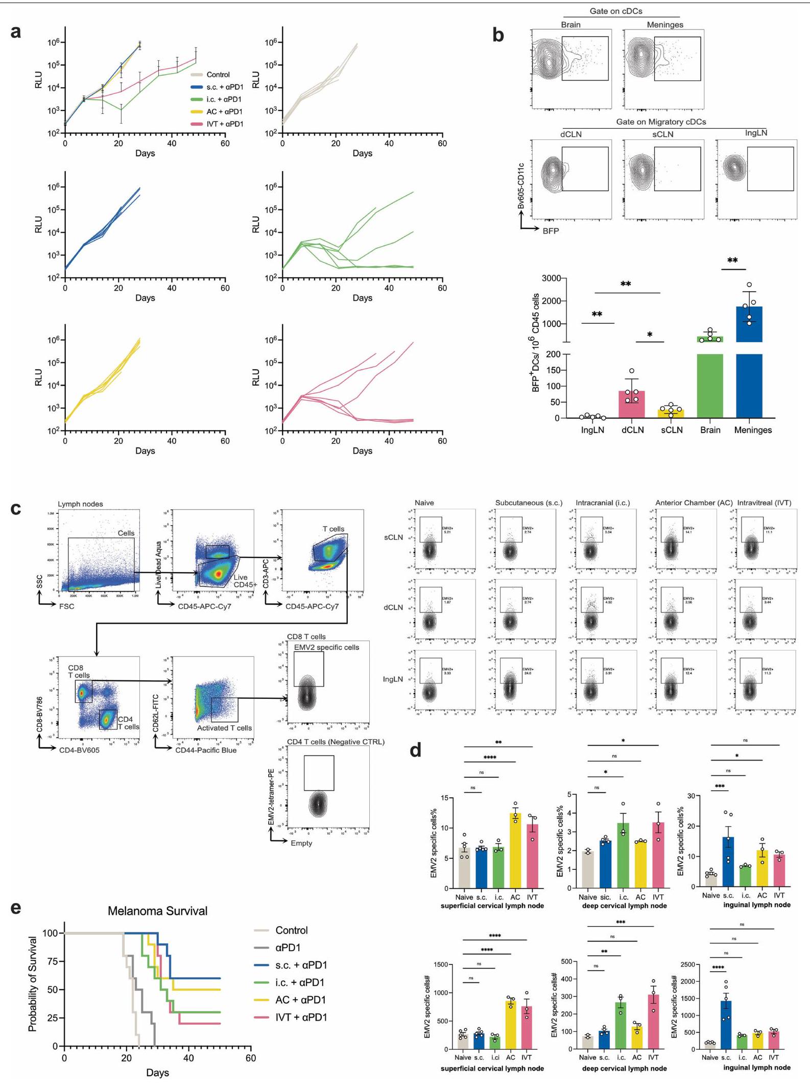 فيروس الهربس البسيط (HSV) لديه القدرة على التأثير على العديد من الأنسجة بما في ذلك الأنسجة العصبية المتعددة مثل العقد الجذرية الظهرية، والعينين، والدماغ – وهو السبب الأكثر شيوعًا لالتهاب الدماغ المميت المتقطع في جميع أنحاء العالم.لفهم المناعة الوقائية ضد فيروس الهربس البسيط (HSV) في الدماغ، قمنا بتطعيم الفئران بفيروس HSV-2 المعطل حرارياً من خلال أربع طرق إعطاء – داخل الصفاق (i.p.) لتحفيز المناعة الجهازية، داخل الجمجمة (i.c.) لتحفيز المناعة المحلية في الدماغ، داخل الغرفة الأمامية (AC)، وداخل الجسم الزجاجي (IVT) – حيث أن الطريقتين الأخيرتين هما مقصورات عينية لها اتصالات تشريحية فريدة مع الجهاز العصبي (الشكل 1a). بعد تحدي مميت بفيروس HSV-2 داخل الجمجمة، توفيت جميع الفئران التي خضعت للتطعيم داخل الصفاق بسبب العدوى، بينما حمت المناعة داخل الجمجمة حواليالفئران (الشكل 1ب)، مما يظهر أن المناعة الجهازية ليست غير كافٍ في توفير الحماية ضد عدوى الجهاز العصبي المركزي. من المRemarkably، أن التطعيم عن طريق الوريد (IVT) حمى أيضًا الفئران، لكن جميع الفئران الملقحة بواسطة AC، مثل الفئران الملقحة عن طريق الحقن داخل الصفاق، لم تنجُ من التحدي (الشكل 1ب)، مما يشير إلى أن التطعيم عن طريق الوريد يحفز استجابة مناعية واقية في الدماغ.