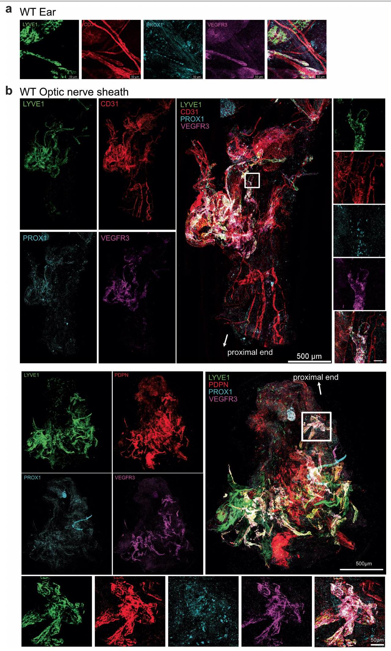 لتحسين حساسية الصبغات المطبقة، قمنا بتشريح غلاف العصب البصري بالكامل من العصب البصري. دون تثبيت التروية في الفئران، انكمش غلاف العصب البصري بعد الاستئصال، مما أدى إلى تجمع الأوعية اللمفاوية نحو الطرف القريب من العصب (الشكل التمديدي 5h). لمعالجة ذلك، قمنا بإجراء تثبيت التروية قبل الاستئصال، مما حافظ على تشريح الشبكة اللمفاوية على طول العصب (الشكل التمديدي 5i). باستخدام نظام الأوعية اللمفاوية في الأذن المعروف جيدًا كتحكم (الشكل التمديدي 6a)، قمنا بالتحقق من وجود الأوعية اللمفاوية في غلاف العصب البصري باستخدام علامات إضافية (VEGFR3، PROX1، LYVE1، CD31 وpodoplanin؛ الشكل 3c والشكل التمديدي 6b). لتوصيف هذه الأوعية بشكل أكبر باستخدام نهج وراثي، استخدمنا نوعين مختلفين من الفئران المبلغة مما يتيح صبغًا محددًا للغاية للأوعية اللمفاوية: VEGFR3-CreER.;فئران R26-mTmG، و PROX1-CreER;CDH5-Dre;R26-STOP-mCherry الفئران (الشكل البياني الموسع 7). معًا، أكدت هذه الطرق المتوازية أن الأوعية اللمفاوية موجودة بالفعل في غمد العصب البصري.