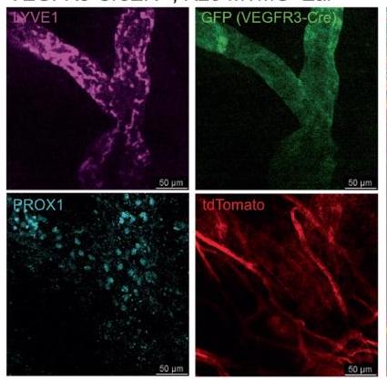 Goat anti-mouse VEGFR3 (#AF743) and Rat-anti-mouse LYVE1 (# MAB2125) were purchased from R&D. Mouse anti-human VEGFR3 (SC-28297) were purchased from Santa Cruz Biotechnology. Rabbit anti-Prox1 (11-002P) and Rabbit anti Human LYVE-1 (102-PA50S) were purchased from Angio-proteomie. Podoplanin (127402) were purchased from biolegend. Armenian Hamster anti- mouse CD31 (2H8) were purchased from Gene Tex. Goat anti-mouse IgG-AF647 (A21235), Donkey anti-goat IgG- AF647 (A21447), Goat anti-rabbit IgG-AF555 (A21428). Goat anti-Armenian Hamster IgG- AF-488 (# A78963), Goat anti-Syrian Hamster IgG-AF-488 (# A78958) were purchased from Invitrogen.