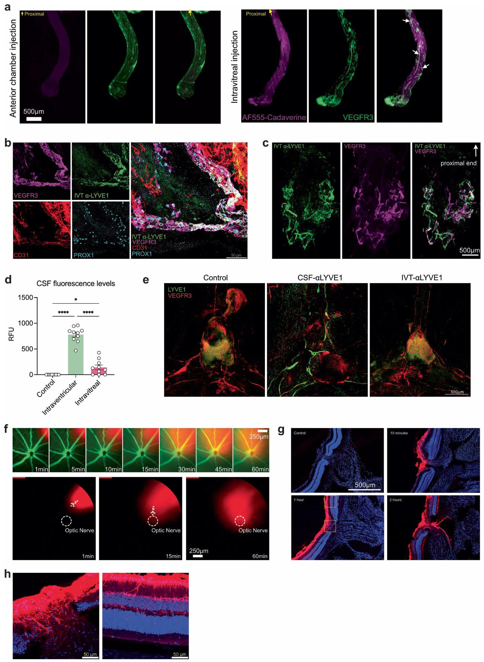 تظهر خرائط الحرارة الممثلة بعد طرح الخلفية للصبغة في العين، والعقد اللمفاوية السطحية (sCLNs) والعقد اللمفاوية العميقة (dCLNs) بعد ساعة من الحقن. e، مخطط للمواقع التشريحية للعقد اللمفاوية السطحية والعميقة. f، g، تم ربط العقد اللمفاوية السطحية، أو العميقة، أو كلاهما جراحيًا. بعد يومين، تم حقن الصبغة في العين عبر الطريق الأمامي (f) أو الطريق داخل الزجاجي (g). تم قياس نسبة احتفاظ الصبغة في العين بعد 12 ساعة. تُعرض البيانات كمتوسط.س.م. في و (شام AC، في جميع الظروف الأخرى)., IVT sCLN; IVT dCLN؛ NS، غير مهم.تم حساب القيم باستخدام تحليل التباين أحادي الاتجاه (ANOVA) مع اختبار المقارنات المتعددة (Dunnett). تم إنشاء الرسوم البيانية في a و e باستخدامبايو ريندر.كوم. (الشكل البياني الممتد 8a). بشكل متسق، يمكن للأجسام المضادة LYVE1 التي تم حقنها عن طريق IVT أن تميز بشكل فعال الأوعية اللمفاوية في غمد العصب البصري (الشكل البياني الممتد 8b، c)، مما يشير إلى أن الجزيئات الكبيرة مثل البروتينات يمكن أن تخترق بحرية هذه الأوعية اللمفاوية من الزجاجية. كانت فرضيتنا الرئيسية حول كيفية انتقال الجزيئات إلى هذه الأوعية اللمفاوية مبنية على فهم الأوعية اللمفاوية السحائية في الدماغ.لقد استنتجنا أن الجزيئات من العين تمر عبر السائل الدماغي الشوكي إلى اللمفاويات المحيطة بالعصب البصري، مشابهة لكيفية انتقال الجزيئات من الدماغ إلى اللمفاويات السحائية. لاختبار ذلك، قمنا بفحص توزيع الصبغة والأجسام المضادة بعد الحقن داخل الزجاجية. لقد اكتشفنا كمية ضئيلة من الصبغة في السائل الدماغي الشوكي بعد الحقن داخل الزجاجية مقارنة بعد الحقن داخل البطين الدماغي (الشكل التمديدي 8d). علاوة على ذلك، لم تتمكن الأجسام المضادة التي تم حقنها عن طريق الحقن داخل الزجاجية من وسم اللمفاويات السحائية بشكل كافٍ. تشير هذه البيانات إلى أن الصبغة المحقونة داخل الزجاجية ربما دخلت الفضاء المحلي للسائل الدماغي الشوكي حول العصب البصري ولم تصرف إلى العقد اللمفاوية الدرقية من خلال السحايا الدماغية التقليدية التي تم وصفها سابقًا (الشكل التمديدي 8e). لتحديد كيفية وصول الجزيئات الكبيرة إلى الأوعية اللمفاوية حول غمد العصب البصري، تتبعنا كيفية مغادرة الجزيئات المحقونة في الجسم الزجاجي للعين في الجسم الحي. بعد حقن AF647-OVA داخل الزجاجية، لاحظنا أن هناك تدفقًا اتجاهيًا نحو رأس العصب البصري (الشكل التمديدي 8f)، وهو ما يتماشى مع النتائج السابقة التي تشير إلى أن فرق الضغط بين الفضاءات داخل العين والفضاء داخل القحف يدفع تدفق السوائل العينية عبر العصب البصري.أظهر الفحص بدقة أعلى بعد قطع العين أن المؤشر كان مركزًا بشكل كبير في رأس العصب البصري (الشكل 8g من البيانات الموسعة)، مع بعض الانتشار عبر الشبكيات. أظهر الانتشار عبر الشبكية نمطًا مشابهًا لأنماط الغليمفاتيك الموصوفة سابقًا في الشبكيات، وهو شريط عمودي بين الخلايا عبر الشبكية. (الشكل 8h من البيانات الموسعة).