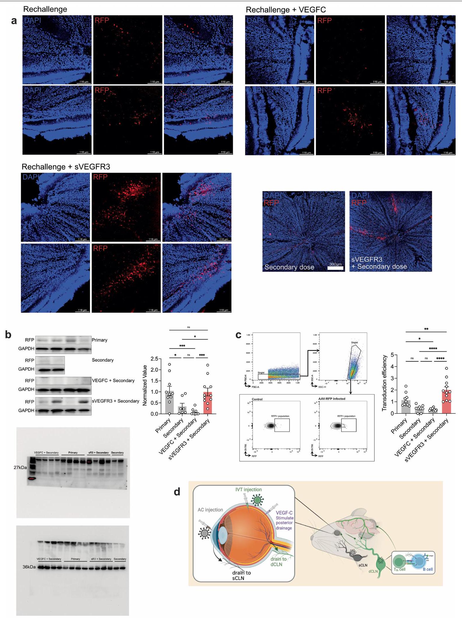معروف بزيادة الاستجابات المناعية من خلال تحفيز تصريف اللمف. على العكس من ذلك، فإن تثبيط إشارات VEGFC خلال النقل الأولي لـ rAAV باستخدام sVEGFR3 سمح للجرعة الثانية بأن تكون فعالة تمامًا مثل العدوى الأولية (الشكل 4f، g والشكل الإضافي 10a-c). تؤكد هذه التجارب على دور اللمفاويات العينية الخلفية في تعديل فعالية العلاجات الجينية المعتمدة على rAAV وتقترح منصة لتجاوز الحواجز الحالية التي تحد من تكرار العلاج الجيني. ، أولية مقابل ثانوية؛ ربط الثانوي مقابل ربط dCLN. التصوير الفلوري في vivo لشبكية العين لتصور الأوعية (باللون الأخضر) وانتقال RFP (باللون الأحمر) مع إضافة VEGFC أو sVEGFR3. شريط القياس،. تحديد شدة RFP من (أساسي، ; ثانوي، ; VEGFC، ; sVEGFR ). ، الأولية مقابل الثانوية؛، الثانوي مقابل VEGFC؛ ، الثانوي مقابل sVEGFR3.تم حساب القيم باستخدام تحليل التباين الأحادي مع اختبار المقارنات المتعددة (دونيت). تُعرض البيانات كمتوسطس.م في ب، هـ وج. الرسومات في ج تم إنشاؤها بـبايو ريندر.كوم.