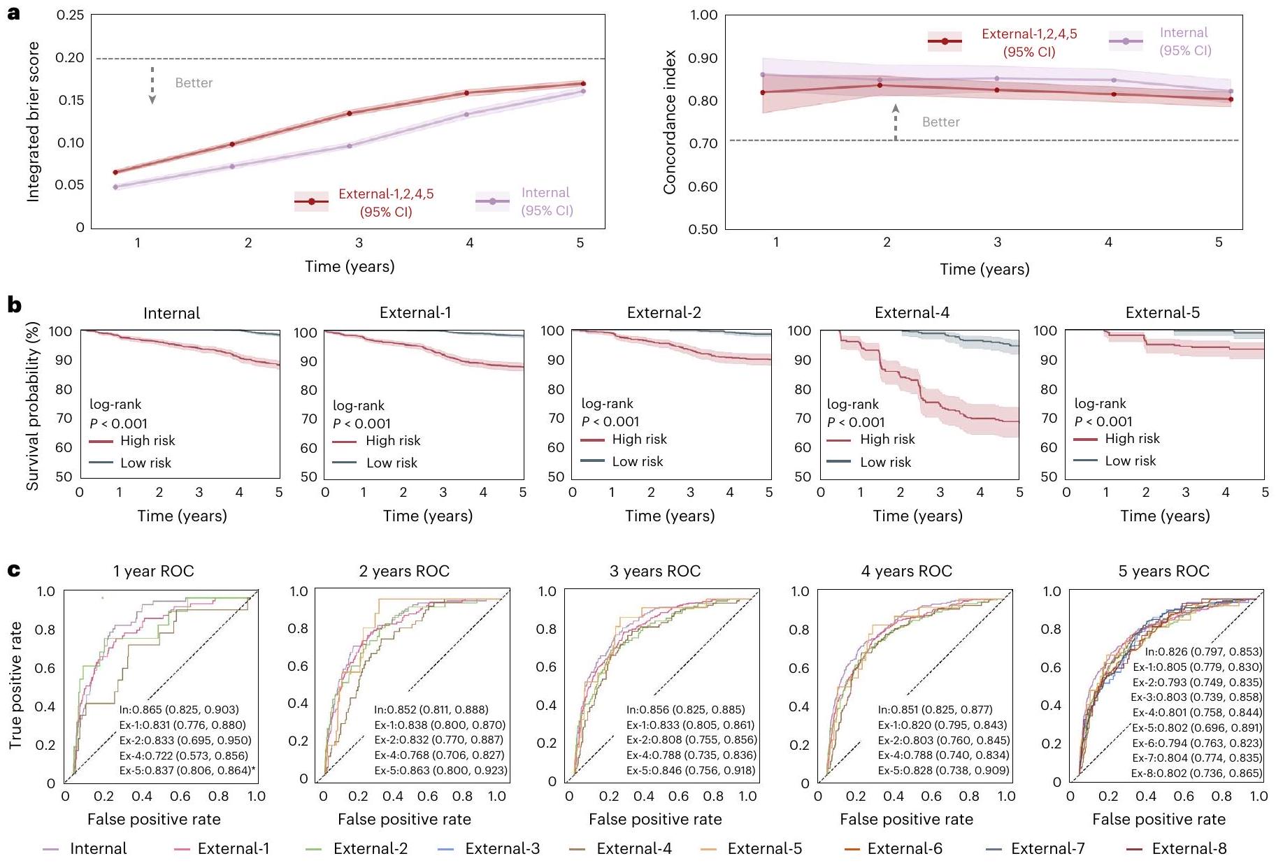 0.797-0.851) لاعتلال الشبكية السكري، 0.820 (فاصل الثقة 95%، 0.785-0.853) لاعتلال الشبكية السكري القابل للإحالة، و0.824 (فاصل الثقة 95%، 0.758-0.880) لاعتلال الشبكية السكري المتقدم، بينما انخفض مؤشر الخطأ المتكامل (IBS) إلى 0.153-0.189 للثلاث مجموعات الفرعية. عند دمج صور قاع العين مع البيانات السريرية، أعطى النموذج المدمج مؤشرات C تتراوح بين 0.835-0.852 وIBS بين 0.145-0.167 للمجموعات الفرعية 1-3 (الجدول الموسع 2). علاوة على ذلك، قمنا بتقييم أداء التنبؤ لنموذج قاع العين في مجموعات البيانات الخارجية وحققنا نتائج مماثلة لمجموعة البيانات الداخلية (الجدول الموسع 2). أشارت النتائج إلى أن صور قاع العين وحدها يمكنها التنبؤ بفعالية بتقدم المرض. وبالمثل لمهمة التنبؤ بالوقت حتى أي تقدم في اعتلال الشبكية السكري، قمنا بتقييم أداء التنبؤ في ثلاث مجموعات فرعية. كما هو موضح في الأشكال الموسعة 3-5، حقق نموذج قاع العين مؤشرات C تتراوح بين 0.820-0.895 وIBS بين 0.045-0.189 في مجموعة البيانات الداخلية للسنوات 1-5. علاوة على ذلك، حققت مجموعات التحقق الخارجية 1، 2، 4 و5 مؤشرات C تتراوح بين 0.794-0.842 وIBS بين 0.058-0.218.