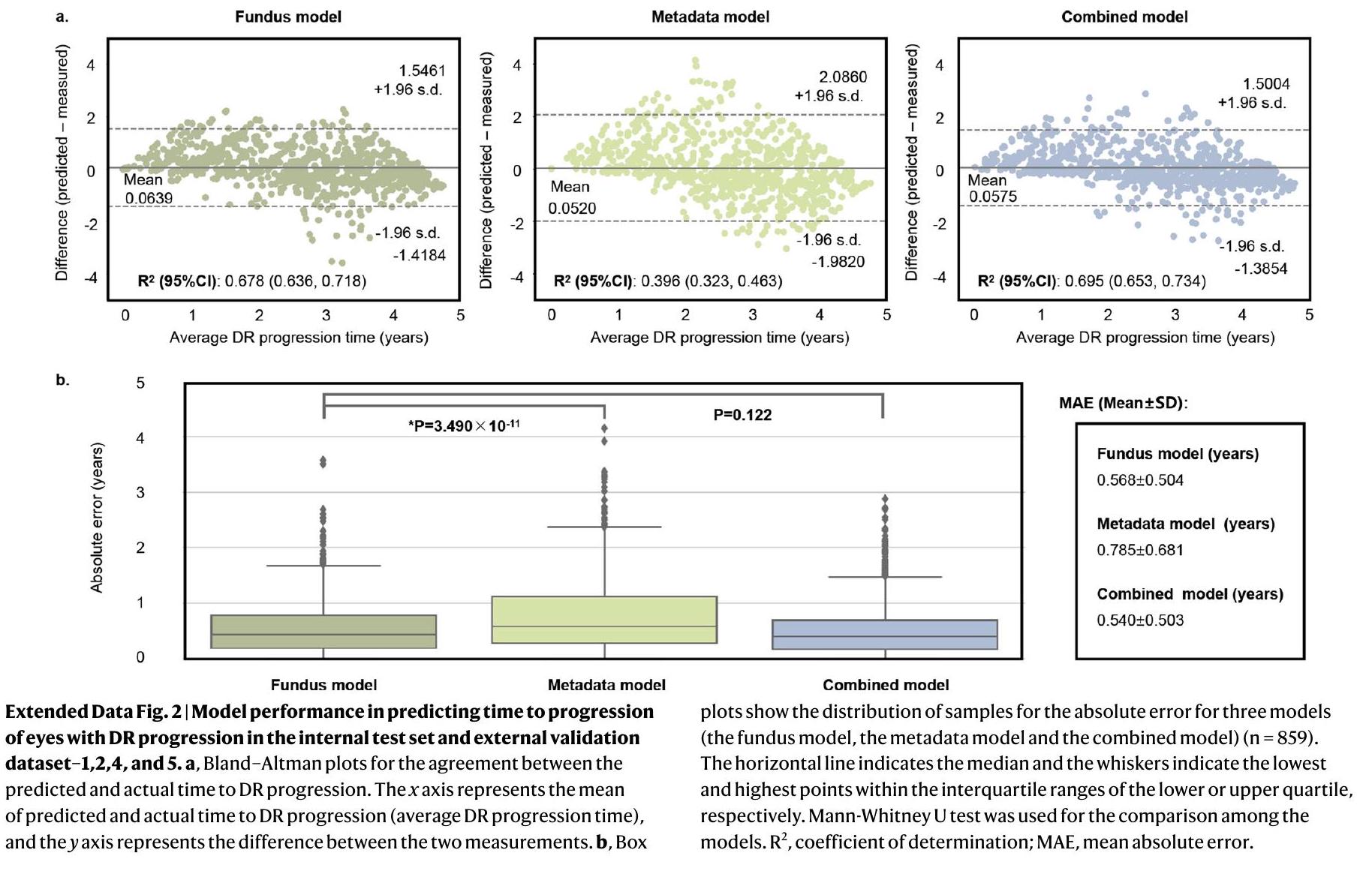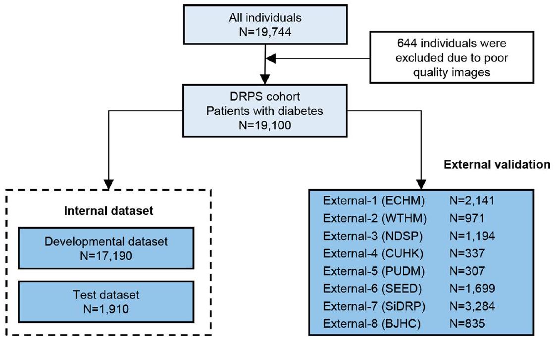 Shanghai Belt and Road International Joint Laboratory for Intelligent Prevention and Treatment of Metabolic Disorders, Department of Computer Science and Engineering, School of Electronic, Information, and Electrical Engineering, Shanghai Jiao Tong University, Department of Endocrinology and Metabolism, Shanghai Sixth People’s Hospital Affiliated to Shanghai Jiao Tong University School of Medicine, Shanghai Diabetes Institute, Shanghai Clinical Center for Diabetes, Shanghai, China. MOE Key Laboratory of AI, School of Electronic, Information, and Electrical Engineering, Shanghai Jiao Tong University, Shanghai, China. Department of Ophthalmology, Huadong Sanatorium, Wuxi, China. Department of Ophthalmology, Shanghai Sixth People’s Hospital Affiliated to Shanghai Jiao Tong University School of Medicine, Shanghai, China. Department of Ophthalmology and Visual Sciences, The Chinese University of Hong Kong, Hong Kong, China. Singapore Eye Research Institute, Singapore National Eye Centre, Singapore, Singapore. Department of Computer Science and Engineering, The Hong Kong University of Science and Technology, Hong Kong, China. Department of Chemical and Biological Engineering, The Hong Kong University of Science and Technology, Hong Kong, China. State Key Laboratory of Ophthalmology, Zhongshan Ophthalmic Center, Sun Yat-sen University, Guangdong Provincial Key Laboratory of Ophthalmology and Visual Science, Guangzhou, China. Department of Ophthalmology, Peking Union Medical College Hospital, Peking Union Medical College, Chinese Academy of Medical Sciences, Beijing, China. Medical Records and Statistics Office, Shanghai Sixth People’s Hospital Affiliated to Shanghai Jiao Tong University School of Medicine, Shanghai, China. Department of Geriatrics, Tongji Hospital, Tongji Medical College, Huazhong University of Science and Technology, Wuhan, China. National Engineering Research Center for Big Data Technology and System, Services Computing Technology and System Lab, Cluster and Grid Computing Lab, School of Computer Science and Technology, Huazhong University of Science and Technology, Wuhan, China. Shri Bhagwan Mahavir Vitreoretinal Services, Medical Research Foundation, Sankara Nethralaya, Chennai, India. Department of Ophthalmology, Shanghai General Hospital, Shanghai Jiao Tong University School of Medicine, Shanghai, China. Beijing Institute of Ophthalmology, Beijing Tongren Eye Center, Beijing Tongren Hospital, -index refers to concordance index. IBS refers to integrated Brier score.