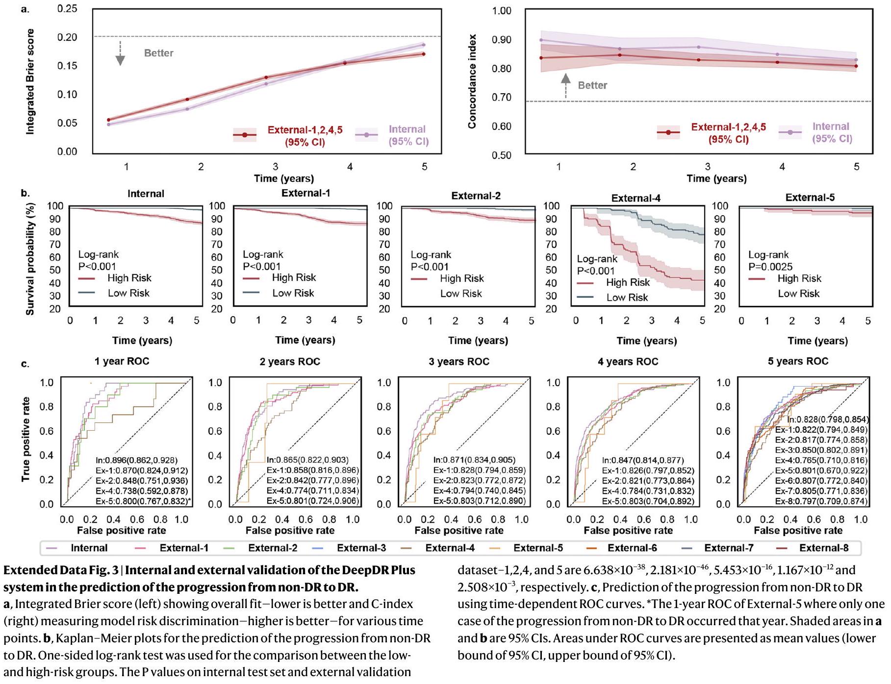 referable DR. a, Integrated Brier score (left) showing overall fit-lower is better and C-index (right) measuring model risk discrimination-higher is better-for various time points. b, Kaplan-Meier plots for the prediction of the progression from non-referable DR to referable DR. One-sided log-rank test was used for the