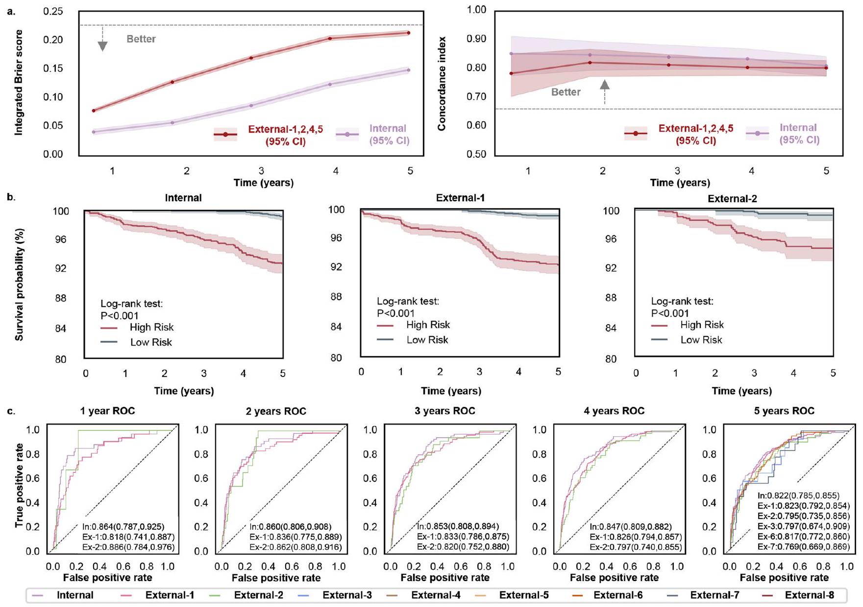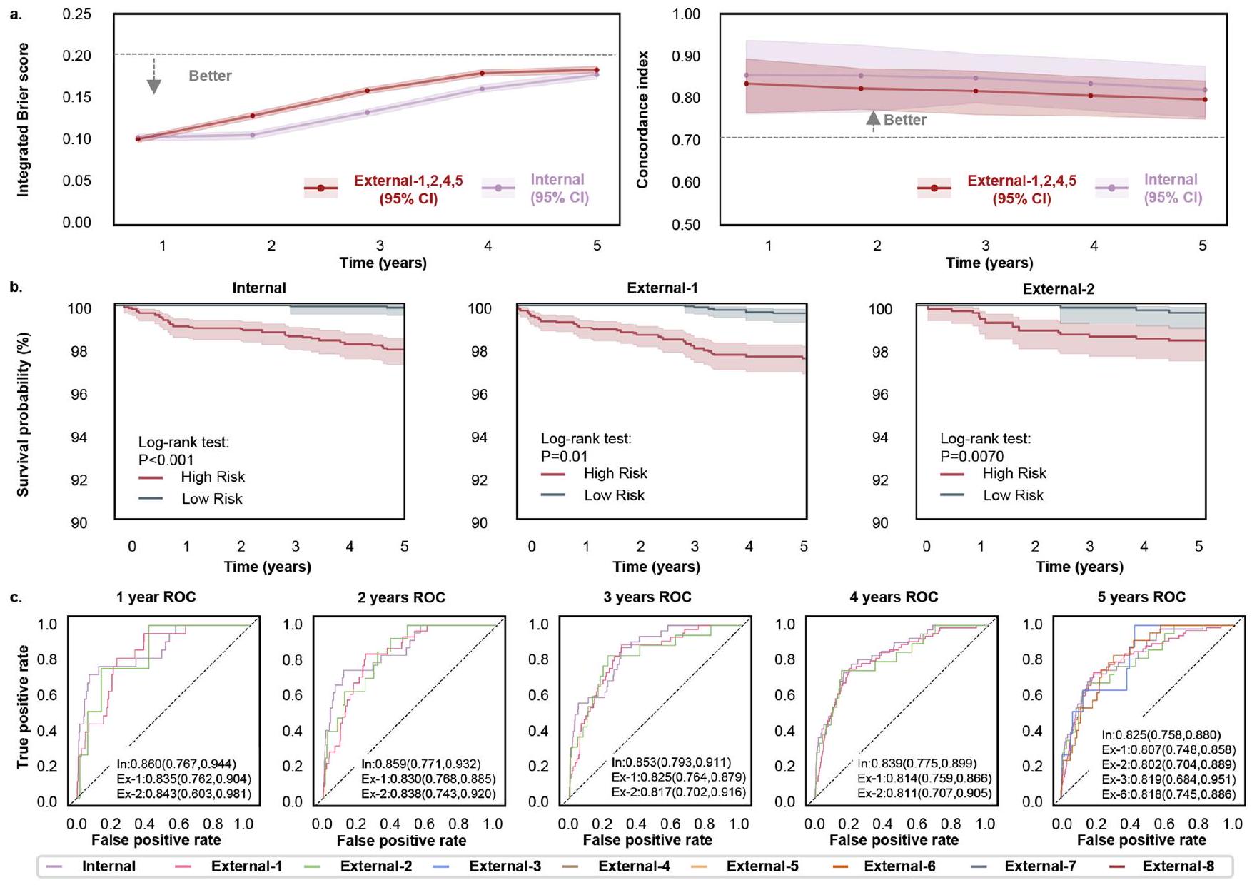 comparison between the low- and high-risk groups. The P values on internal test set and external validation dataset -1 and 2 are