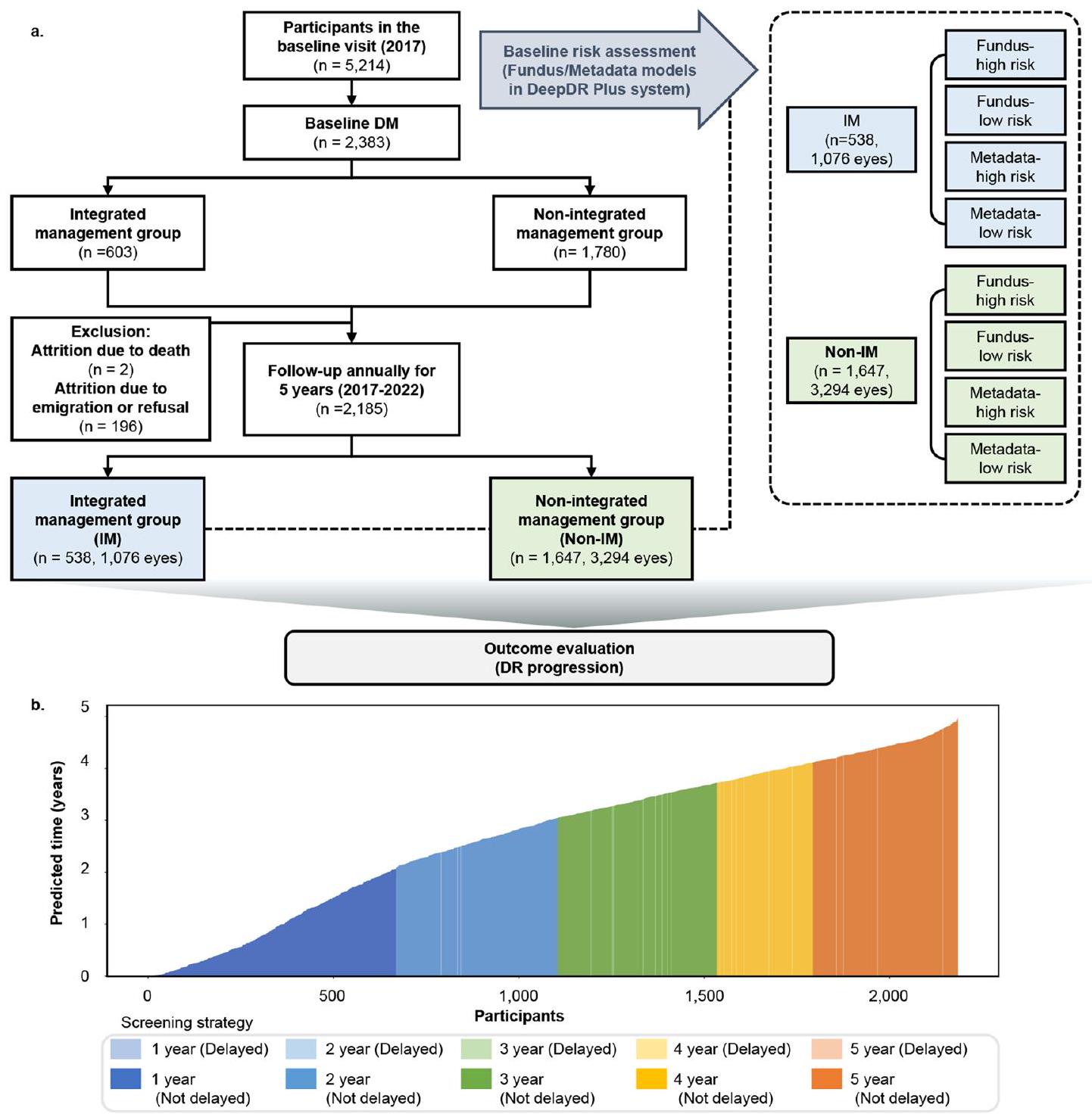 لتقييم فعالية نظام DeepDR Plus مع دمج سير العمل السريري، أجرينا دراسة في العالم الحقيقي ضمن دراسة مستقبلية مجتمعية شملت البالغين الصينيين (الطرق). تم تضمين ما مجموعه 2185 مشاركًا في التحليل، مع 538 مشاركًا في مجموعة الإدارة المتكاملة (برنامج إدارة مرض السكري المتكامل بين المستشفى والمجتمع) و1647 مشاركًا في المجموعة غير المتكاملة. تم تزويد المشاركين في مجموعة الإدارة المتكاملة بقياسات سريرية وأيضية منتظمة، بإشراف متخصصين في المستشفيات الشاملة، وتلقوا إرشادات حول نمط الحياة ودعم الأقران في مراكز خدمات الصحة المجتمعية.