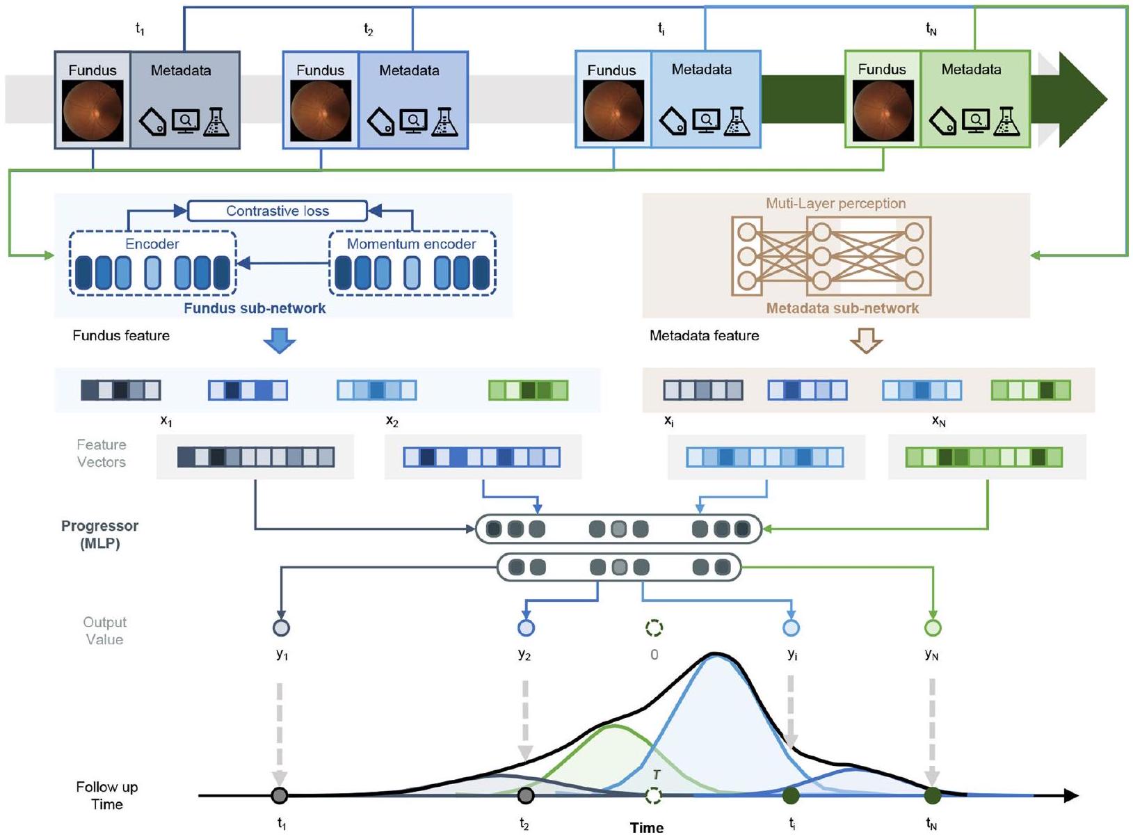 high-level feature vectors, while the predictor estimates the survival time in a fixed-size mixture of Weibull distributions based on the fundus feature vectors to generate the fundus score. The metadata and combined models share the same structure but differ in their inputs compared to the fundus model. The metadata model takes metadata as inputs, while the combined model takes both metadata and fundus score as inputs.