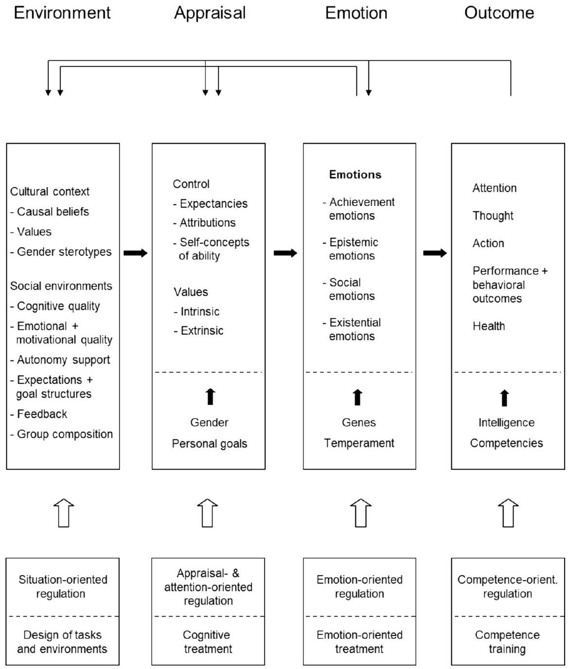 (1) The cognitive quality of achievement environments, such as the learning environment in the classroom, influences the acquisition of competencies, the competent performance of achievement activities, and resulting control perceptions (e.g., Pekrun et al., 2023a). By fulfilling needs for competence (Ryan & Deci, 2017), high-quality environments can also boost value. A critically important variable is the difficulty level of tasks. If tasks are too demanding, lack of control and negative emotions can result. If tasks are too easy, they may not be enjoyable either, and boredom can result instead.