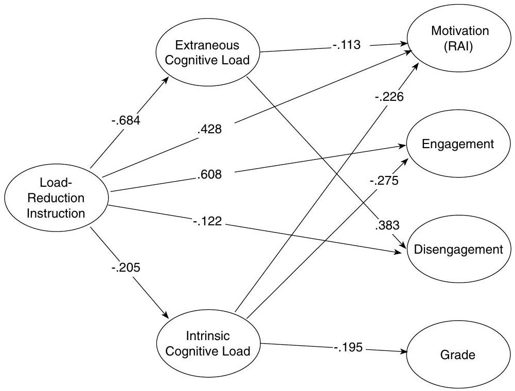 learners to engage more deeply in their learning, and may even prompt learners to become frustrated and disengage. The present findings also have implications for teachers and their use of teaching strategies: load reduction instruction strategies reduce cognitive load and are themselves motivating and engaging. Based on these findings, it seems that there is minimal risk posed for motivation and engagement by using explicit teaching strategies to reduce cognitive load. Outside of instructional strategies, the teacher’s motivating style itself has consequences: attempts to motivate students using external contingencies, excessive demands, or a lack of structure pose risks to students in terms of increased cognitive load and reduced motivation and engagement.