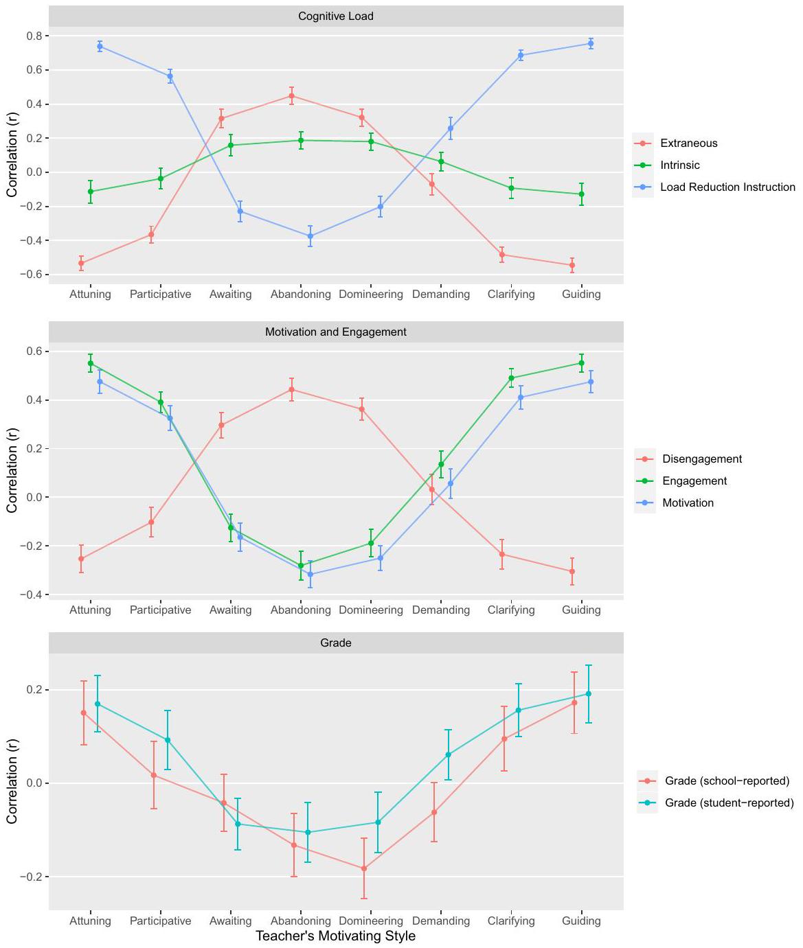 disengagement, and achievement were predicted by cognitive load and, in turn, load reduction instruction. Age, gender, and SES were included in the model as covariates (i.e., predicting all other factors in the model). The model was estimated first as a measurement model (confirmatory factor analysis (CFA)) with all latent correlations freely estimated, before imposing regression (structural) constraints. We did not make any hypotheses (or findings) in relation to mediation as the model is based on cross-sectional data, but for completeness, we also report indirect effects. To address Aim 2, we studied teacher’s motivating style. Using the circumplex structure of the teacher’s motivating style, we correlated the different subareas within the circumplex model with load reduction instruction, intrinsic and extraneous cognitive load, motivation, engagement, and achievement. We expected a sinusoidal pattern of correlations between the discerned styles in the circumplex and the different assessed outcomes.