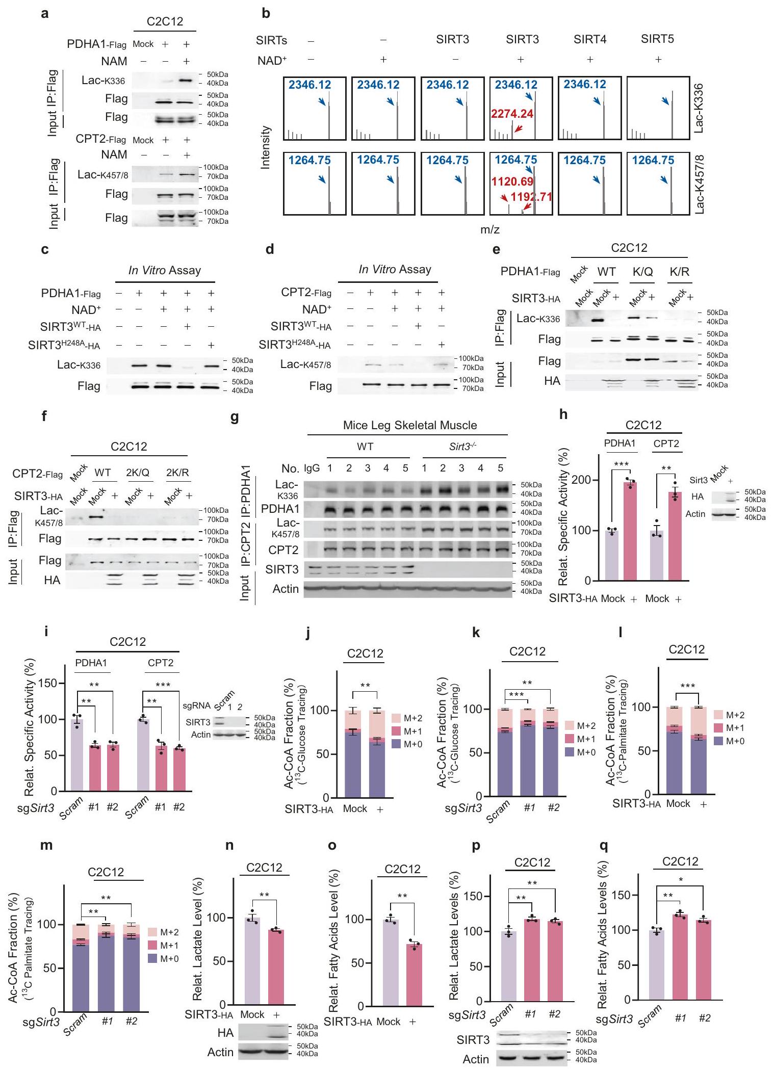 كانت الأنشطة المحددة لـ PDHA1 و CPT2 المعبر عنها في خلايا C2C12 التي تعبر عن SIRT3 بشكل مفرط وخلايا Sirt3 KO أعلى وأقل، على التوالي، من تلك المعبر عنها في خلايا C2C12 (الشكل 6h، i). ومع ذلك، لم يؤثر لا التعبير المفرط عن SIRT3 ولا Sirt3 KO على الأنشطة المحددة لطفرات PDHA1 و CPT2 التي لا تحتوي على مواقع اللاكتيل (معلومات إضافية، الشكل S7c-f). علاوة على ذلك، زاد التعبير المفرط عن SIRT3 وقلل Sirt3 KOالإنتاج من-جلوكوز (الشكل 6j، k) و-بالميتات (الشكل 6ل، م)، على التوالي، في خلايا C2C12.