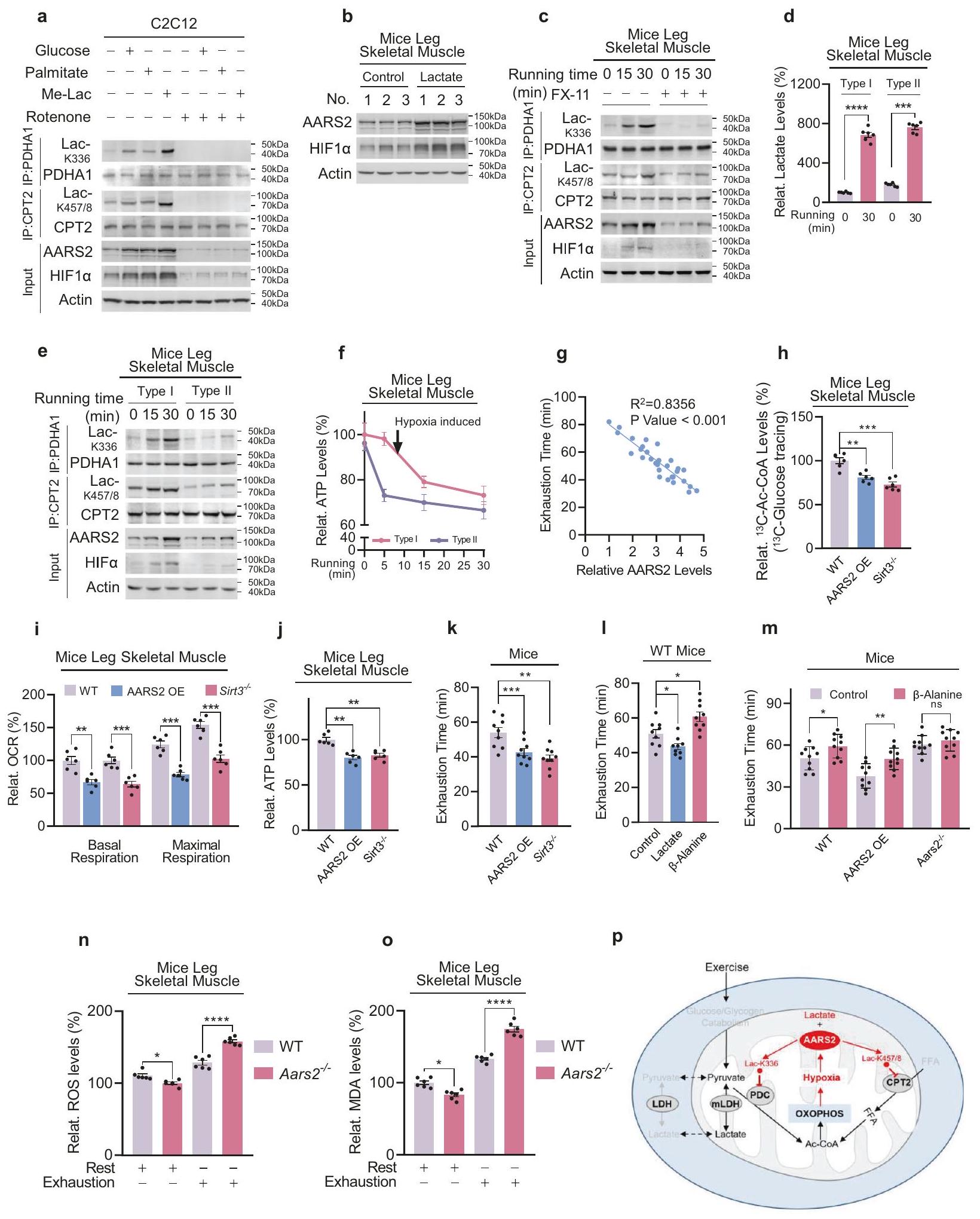 كانت مستويات Lac-K336 و Lac-K457/8 في عضلات الساق الهيكلية للفئران مرتفعة كما هو الحال فيتحت التعبير المفرط المتزامن لـ AARS2 وعلاج Me-Lac (الشكل 5 م)، وبلغتبعد جري الفئران لمدة 30 دقيقة (الشكل 5ن) أو عندما تتعرض عضلات الفئران لنقص الأكسجين (الشكل 50)، مما يشير إلى أن جزءًا كبيرًا من PDHA1 وCPT2 يتم لاكتيله تحت نقص الأكسجين داخل خلايا العضلات وارتفاع مستوى اللاكتات في الجسم، وهي حالة تحاكي تمارين التحمل.