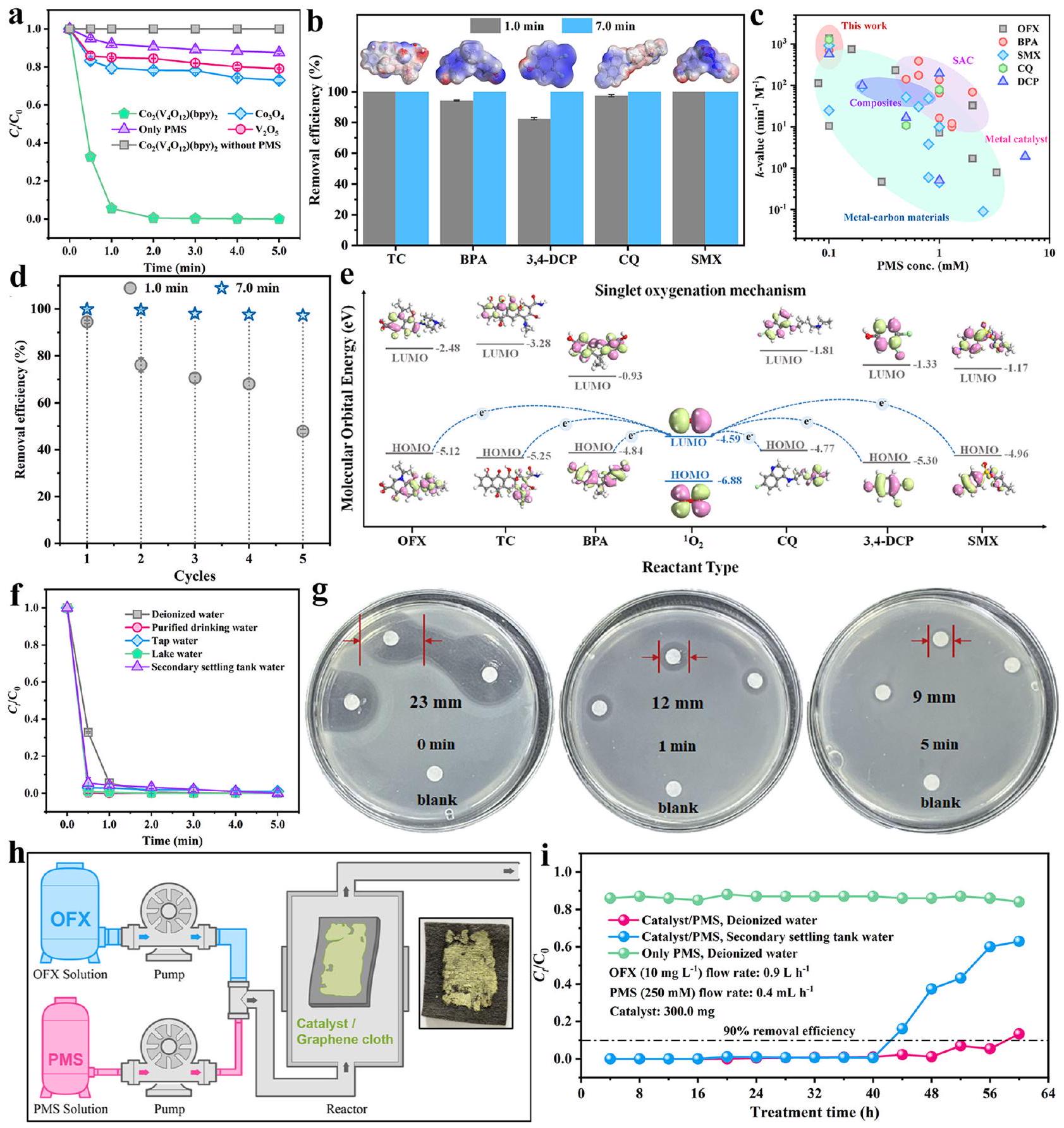 To evaluate the practical application prospects of (bpy) as PMS activator, powder was fixed onto the graphene cloth (Fig. 2h) to perform the long term treatment to both simulated wastewater containing OFX formulated from pure water and actual secondary sedimentation tank water were performed (Supplementary Fig. 29). Figure 2i exhibited that the OFX elimination efficiency in both pure water and actual secondary sedimentation tank water could maintain up to 56 h and 40 h in PMS system, while the OFX removal efficiency of the individual PMS system was less than . Additionally, the immobilized ensured the catalyst stability during the reaction process (Supplementary Fig. 30a, b), in which the leached Co ( ) and concentrations were far below the maximum pollutant level target set by the Chinese National Standard (Co: GB 3838-2002; V: GB 26452-2011). The PXRD pattern (Supplementary Fig. 31) and SEM image (Supplementary Fig. 32) of the used after the reaction matched well with the fresh sample, demonstrating the stable phase, composition and morphology of . Meanwhile, the TOC removal efficiency could reach about within 48 h in PMS pure water system (Supplementary Fig. 30c), implying that OFX could be partly mineralized into and . These results confirmed that the catalyst possessed great potential for practical application.