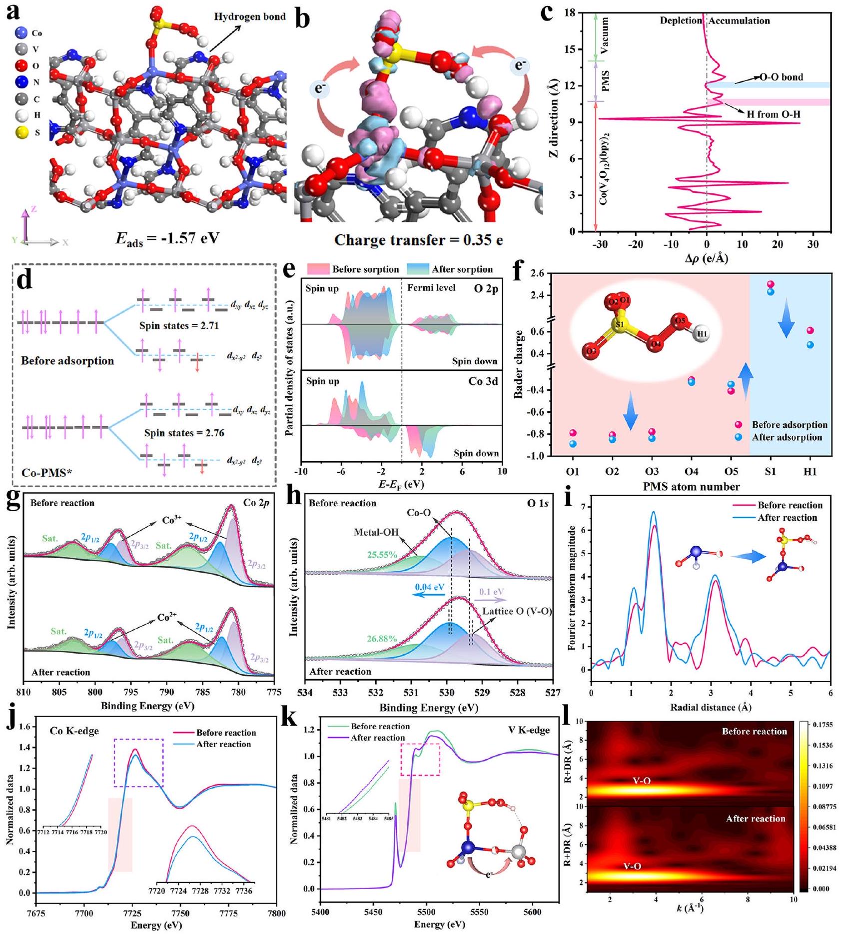 الشكل 3 | تحديد مواقع التحفيز واستكشاف آلية الإثارة. أ نموذج الامتصاص الأمثل لـ PMS علىوطاقة الامتزاز المقابلة.فرق كثافة الإلكترون لنموذج الامتصاص الأمثل لـ PMS. ج فرق كثافة الإلكترون المتوسطة على المستوىحالة ملء إلكترونات مدارات d لعنصر الكوبالت وحالة الدوران قبل وبعد امتصاص PMS (e) الكثافة الإلكترونية لحالة O 2p و Co قبل وبعد امتصاص PMS.تغيير شحنة مولكين لنموذج PMS. طيف XPS لـ (g) Coقبل وبعد التفاعل. طيف EXAFS لحافة كوبالت K، (j) طيف حافة كوبالت K و (k) طيف حافة فانياديوم K XANES بالإضافة إلى (l) مخططات WT لـقبل وبعد التفاعل (أدخل: حافة الامتصاص والخط الأبيض لـ Co و V، على التوالي). كانوا أكثر عرضة للإزالة، مما كان أكثر ملاءمة لتحقيق تنشيط PMS.