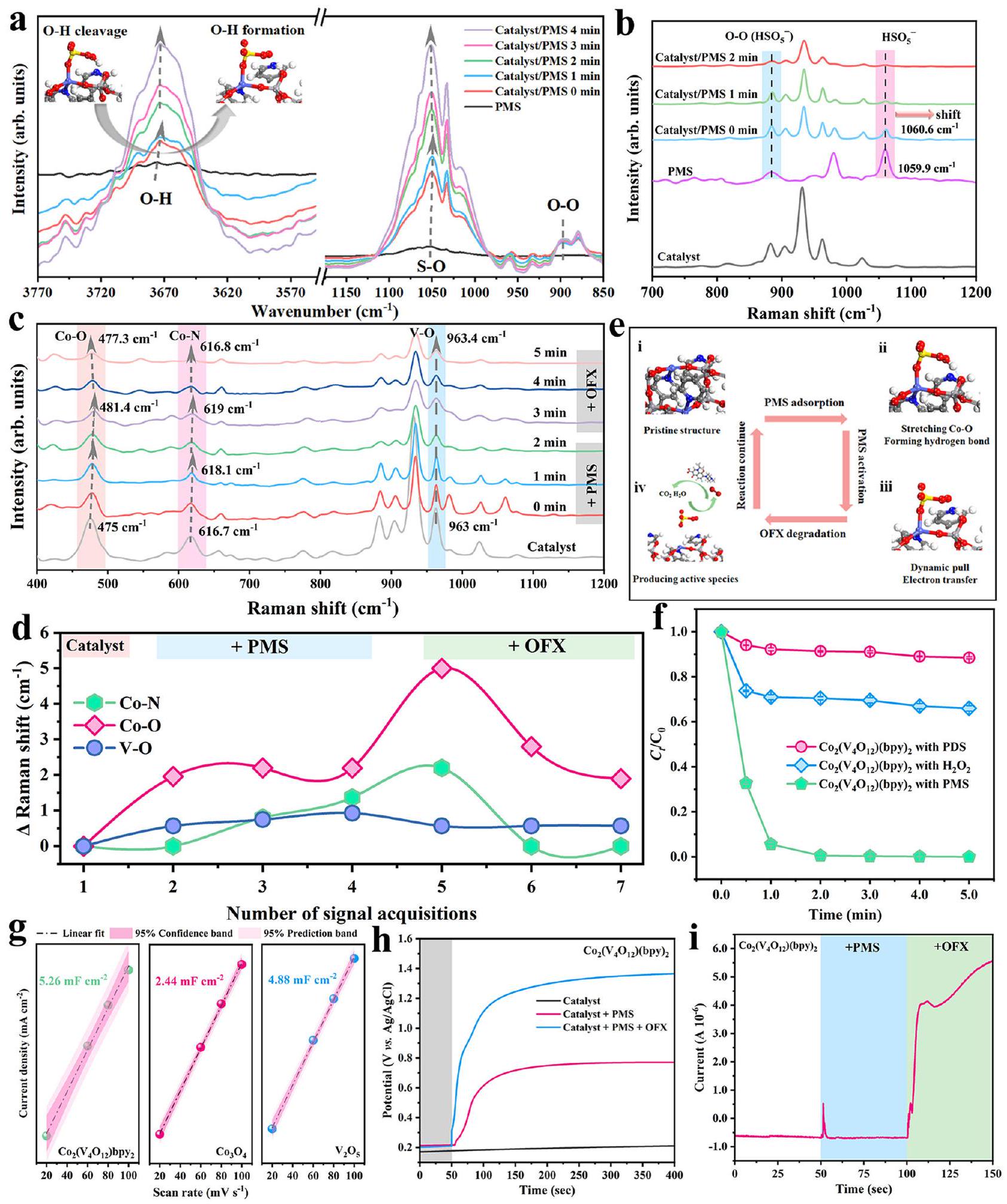 In situ FTIR under atmosphere (Supplementary Fig. 50a, b) and In situ Raman spectroscopy (Supplementary Fig. 50c, d) were performed to further investigate the intermolecular interaction between PMS and (bpy) during the PMS activation . The FTIR spectra of individual PMS (Supplementary Fig. 51) showed that the peaks at and were assigned to the bond and S-O bond, respectively . When PMS with a certain concentration was added into the system, the peak of O-H bond (Fig. 4a) exhibited a rapid blue shift from to . Then, the peak of O-H bond was kept at after 1.0 min reaction, which might be ascribed to the rapid PMS consumption in PMS system. The dynamic variation of peak could be attributed to: (i) bond from PMS presented strong interaction with catalyst surface; and (ii) bond in PMS was broken due to the interaction, which led to the formation of the new and steady bond between H from PMS and terminal O from on the catalyst surface. XPS analyses also indicated (Fig. 3h) that the content of hydroxyl group on the catalyst increased after Fenton-like reaction, which might be attributed to the interaction between terminal O from catalyst and terminal H from PMS. Meanwhile, the slight shift of S-O peak (Fig. 4a) could be attributed to the adsorption effect of metal center toward PMS, which was comparable to DFT calculations. More significantly, the characteristic stretching of O-O at (Fig. 4a) appeared under the conditions of atmosphere and the absence of dissolved oxygen , further verifying the generation of in PMS system due to that the interference of on bond was eliminated. Additionally, In situ Raman with laser excitation at 532 nm was adopted to characterize the change of PMS during the reaction. The characteristic vibration of gradually shifted to higher wavenumbers (Fig. 4b), affirming the electron transfer process from catalyst to . Also, the new peak at about disappeared after (bpy) was added into the PMS solution , indicating that the high-spin complexes (catalyst-PMS*) with strong oxidation ability was not formed. Moreover, In situ Raman experiments were performed to facilitate to observe the dynamic variation of metal centers, in which the Raman peaks at and could be ascribed to the and V-O stretching frequencies (Fig. 4c), respectively . Compared with the dynamic structure of and bond, the slight dynamic change of V-O bond could be neglected (Fig. 4d) due to the stable structural characteristics of cluster , matching well with HR-TEM image. As shown in Supplementary Fig. 52, the crystal lattice of of the used was almost identical to that in the fresh one. On the contrary, noticeable stretching vibration of and bonds indicated the mutual affinity between Co sites and PMS because the metal centers will induce structural response to