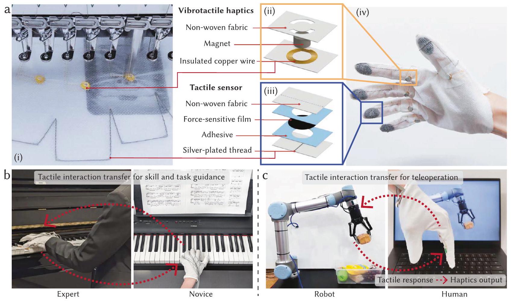 Fig. 1 | Fabrication, structure, and applications of tactile interaction transferring smart gloves. a A full-sized textile-based glove (iv) with integrated tactile sensors (ii) and vibrotactile haptics (iii) is digitally designed and automatically fabricated using a digital embroidery machine (i). Leveraging these gloves with