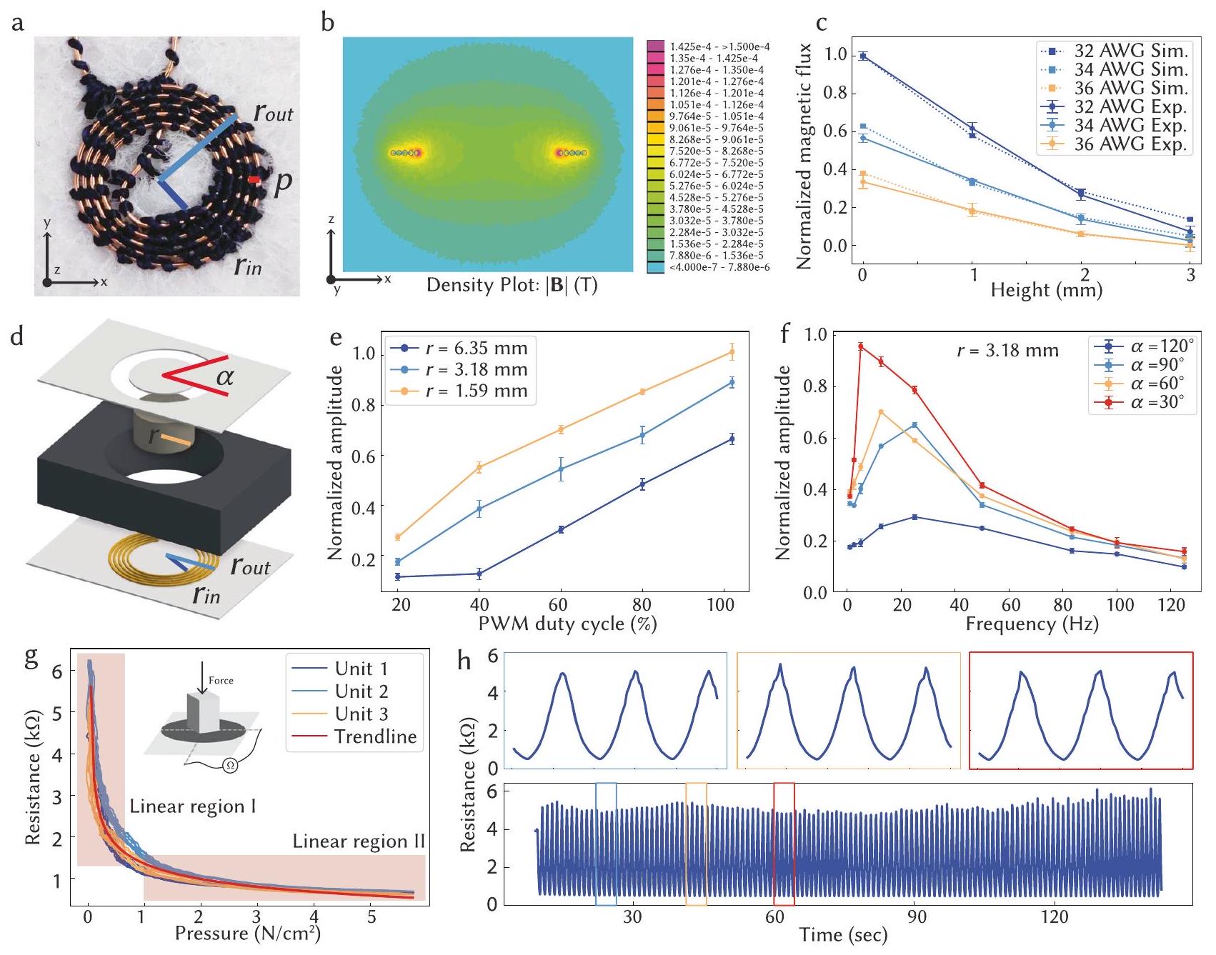 Figure 2a, b demonstrate a representative design of an embroidered copper coil and the corresponding simulated magnetic flux heatmap (with 1 A alternating current input), respectively. The measured magnetic flux from the embroidered magnetic coils (subjected to a full-scale duty cycle input) agrees with the simulation result (Fig. 2c). The magnetic flux generally decreases with the increase in sensing height and magnetic wire gauge. Furthermore, the displacement of the vibrotactile haptic units can be captured and quantified through a high-speed camera (Supplementary Movies 2, 3 and Supplementary Fig. 4c). To enhance the haptic actuator response for quantitative analysis, a foam spacer was added to anchor the base height level and only one of the symmetric fabric links was obtained to amplify the displacement. The vibrotactile displacement increases with the rise of the input PWM duty cycle and with the decrease of permanent magnet size, which obtains higher magnetic field-to-weight ratios (Fig. 2e). Figure 2 f presents the normalized vibration amplitudes of a typical vibrotactile haptic unit (with a radius of ) across various left-out fabric link angles ( ) and alternating input frequencies, effectively highlighting the resonant frequencies of different designs. Notably, as the fabric link angle decreases, the vibration amplitude intensifies, while the resonant frequency concurrently decreases.