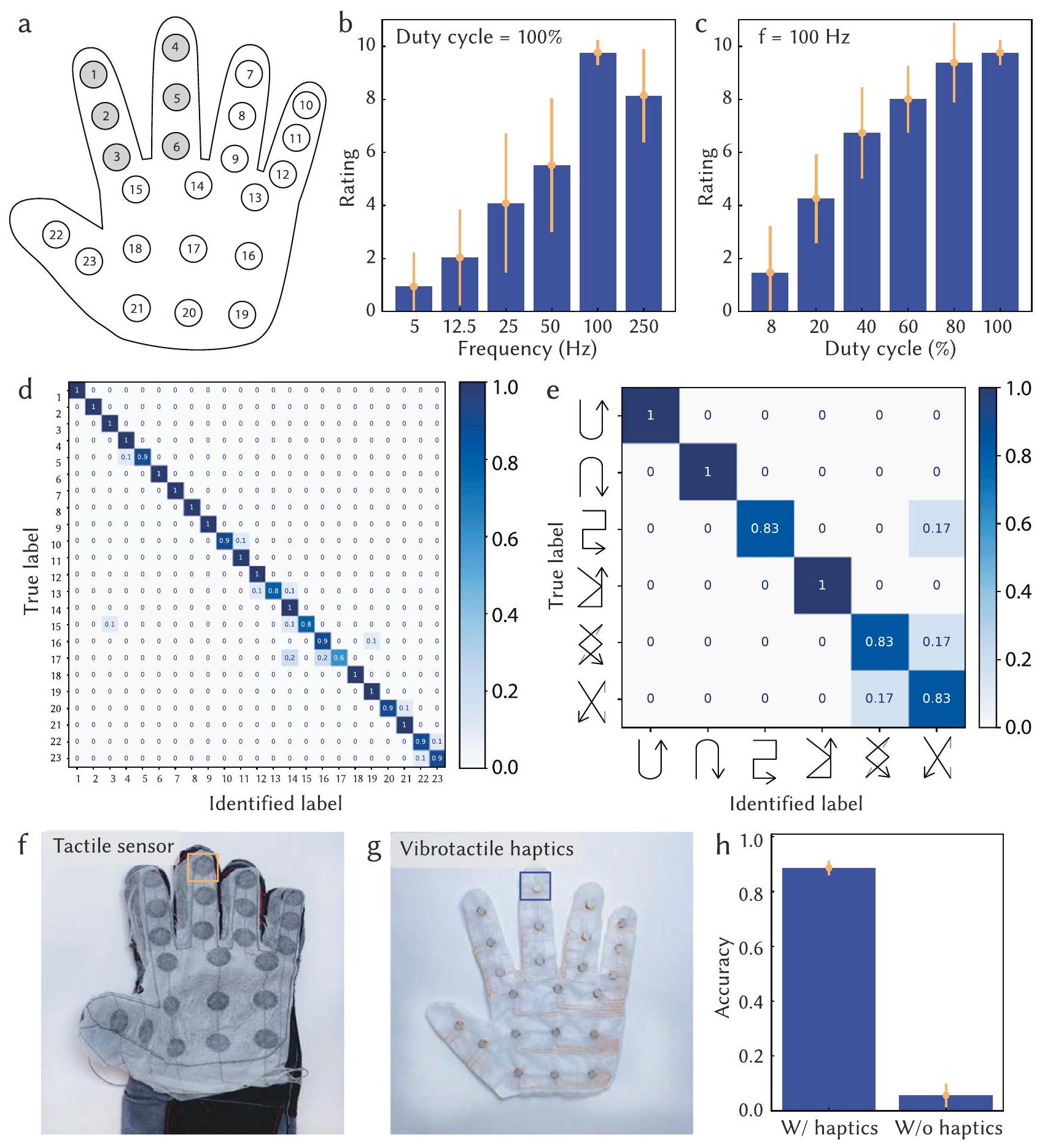In addition, tests were performed to explore whether users could identify where haptic feedback is being applied on the hand, and whether they can distinguish between temporal patterns of activation. Wearing a glove with 23 embroidered haptic units distributed across the inner hand as shown in Fig. 3a, g), participants were able to identify the activated vibrotactile unit (full PWM duty cycle at 100 Hz ) with an average accuracy of 94% (Fig. 3d). Users also identified temporal patterns of activating vibrotactile units with an average accuracy of (Fig. 3e). Notably, the discriminative capability remains unaffected by interference from a constantly vibrating haptic unit (Supplementary Fig. 7). These results are promising for effectively conveying spatial and temporal information and for using the textile-based system integrated with tactile sensing and vibrotactile haptic capabilities to transfer physical tactile interactions.
