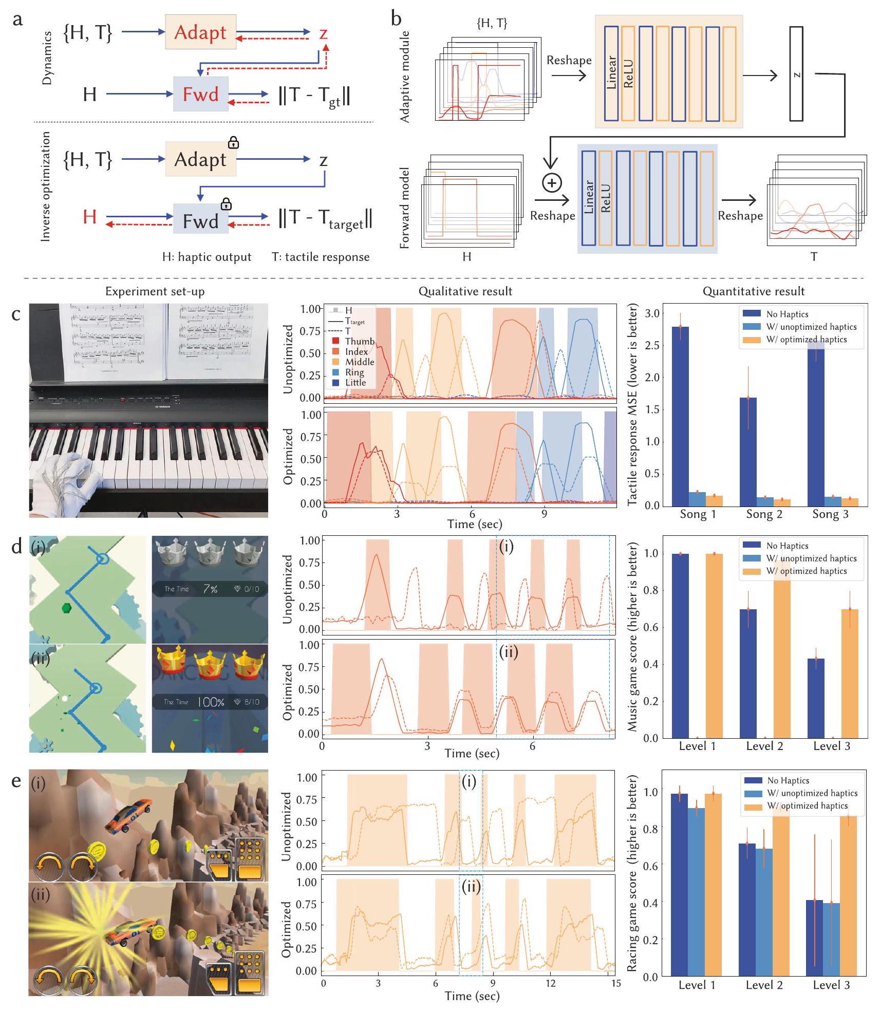 Validation. Both offline and online evaluations of the pipeline were conducted. Qualitative results of the forward dynamics model are shown in Supplementary Fig. 9d. We first validated by comparing the optimized haptic instructions with the ground-truth pre-generated haptic sequence from the recorded dataset (Supplementary Fig. 9e). We further validated online by comparing the target tactile sequence with the user’s output tactile sequence when given unoptimized and optimized haptic instructions (Supplementary Fig. 9f). More online validation was performed in piano playing, music rhythmic gaming , and car racing gaming scenarios. Piano playing was performed on a digital piano (YAMAHA P-125) with a 5 -finger control. The music rhythmic game was played on a laptop using a mobile game emulator (Mumuplayer), where the user directed the moving line by left-clicking the mouse with only their index finger. The car racing game was performed on a laptop through an online gaming platform, where users mostly controlled the balance and speed of the car by pressing direction keys using their middle and ring fingers. Validation and comparison of the effectiveness of our optimization pipeline were performed three times on two users. To eliminate bias, users were asked to get familiar with the validation scenarios before the experiments and to perform the tasks first with optimized haptic instructions, then with unoptimized haptic instructions, and lastly without any haptic instructions. Tactile information was recorded at 50 Hz and haptic instructions were generated at 100 Hz .
