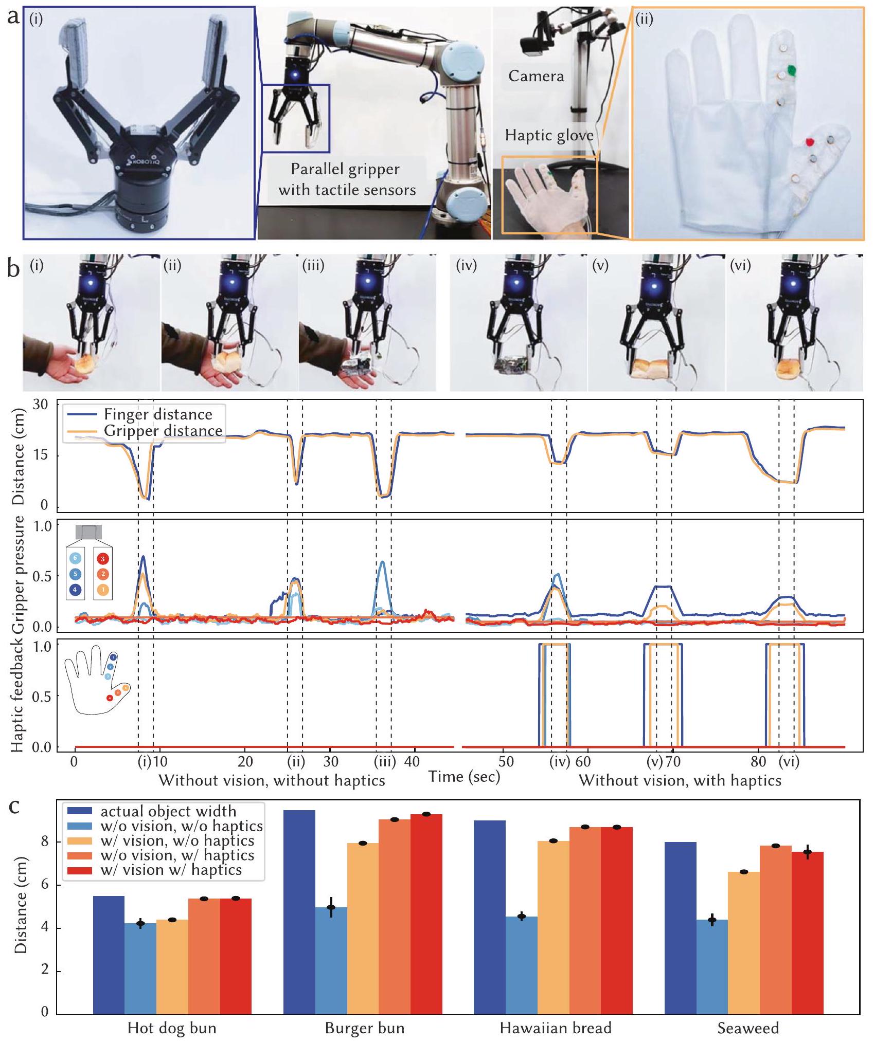 Fig. 5 | Transfer of tactile information from robot to human for teleoperation. a Overview of the teleoperation setup, featuring a parallel gripper equipped with tactile sensors (i) and a user wearing a full-sized glove integrated with vibrotactile units on the thumb and index finger (ii). The visual system tracks embroidered green and red color blocks for distance measurement purposes. Teleoperated grasping of a hot dog bun, Hawaiian bread, and a soft plastic box without visual feedback and with optional tactile information transferring through haptic feedback. The plots show the synchronized distance measurement of users’ finger