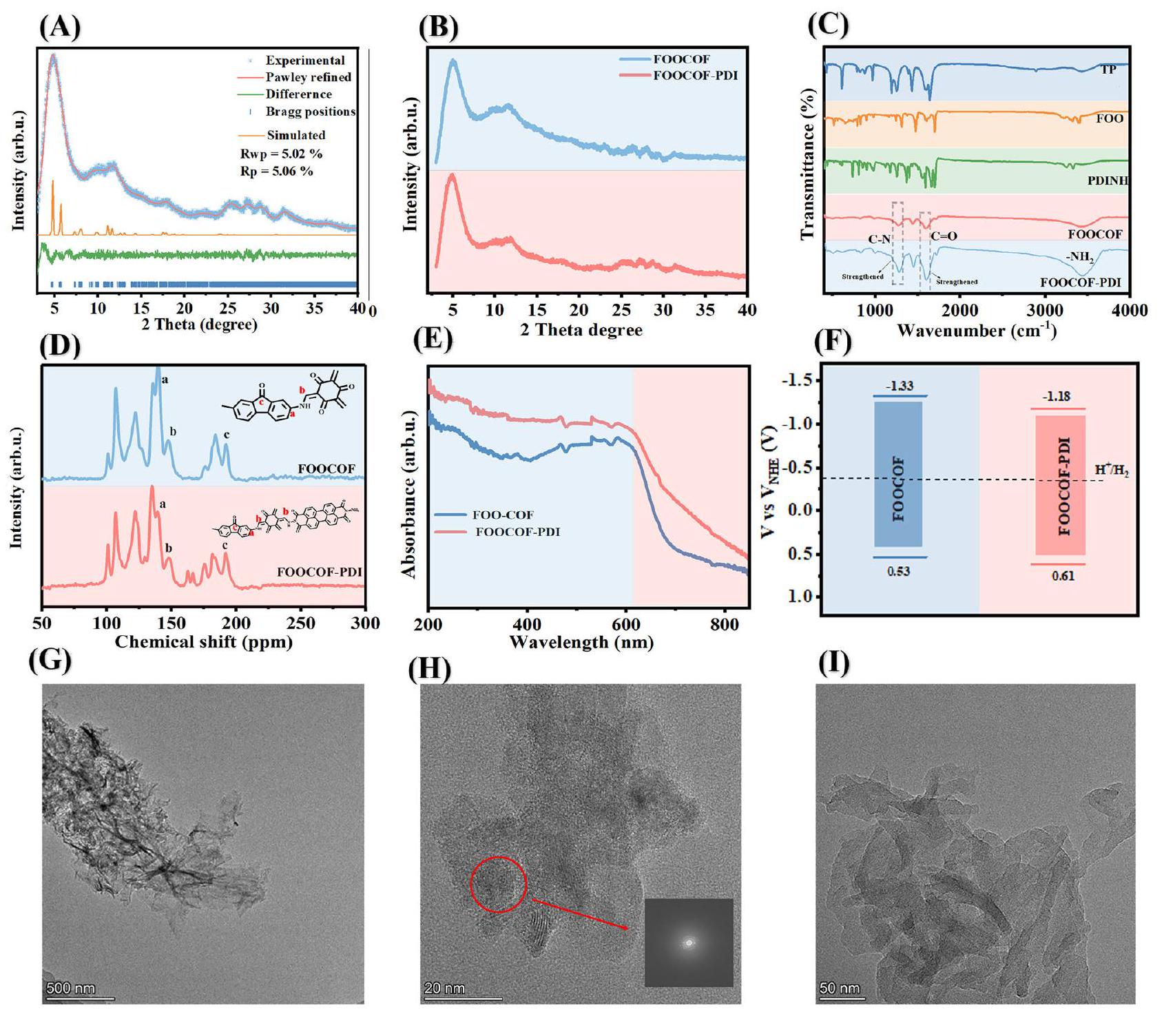 CP/MAS الحالة الصلبةطيف NMR، (E) نمط الطيف الانعكاسي التفاضلي UV-vis و(F) مستوى النطاق لـ FOOCOF وFOOCOF-PDI. G صورة TEM لـ FOOCOF، (H) صور TEM عالية الدقة (HRTEM) لـ FOOCOF؛ (I) صور TEM لـ FOOCOF-PDI.