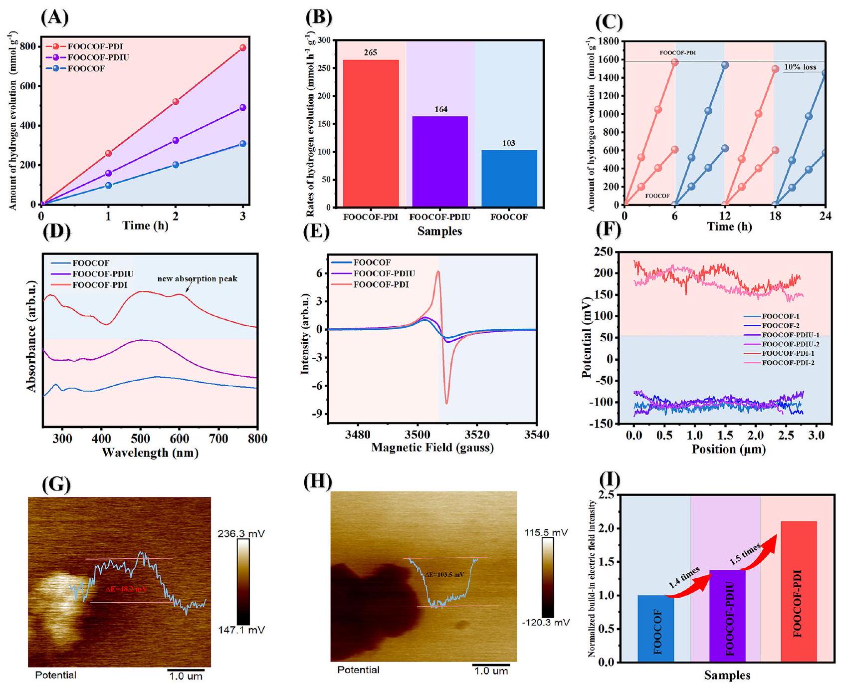 ordered stacking, an intrinsic electric field is generated; otherwise, the dipoles would cancel out due to the disordered assembly . We analyzed the built-in electric field of the prepared samples. Due to the existence of dipoles, the built-in electric field is enhanced. In general, the strength of the built-in electric field can serve as a kinetic factor driving charge separation, thus necessitating a quantitative evaluation .According to the theory of Zhang et al., the determination of the material’s embedded electric field is monotonically positively correlated with its surface charge density and zeta potential . Utilizing KPFM (Kelvin probe force microscopy) to detect the surface charge density of the sample, it is shown that the highest potential of FOOCOF-PDI reaches up to 103.5 mV (Fig. 3G, H). Combined with the zeta potential results shown in Figure S30, it confirms that the built-in electric field of FOOCOF-PDI are 2.1 and 1.5 times stronger than that of FOOCOF and FOOCOF-PDIU (Fig. 31).