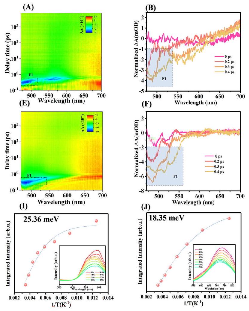The interface dipoles caused by charge transfer can promote the dissociation of excitons into free carriers, as demonstrated in numerous prior studies . The early detection of excitons (within 0.5 ps ) in the prepared COFs was carried out using femtosecond transient absorption spectroscopy (fs-TAS). The prepared sample exhibited a negative peak at and a positive peak at , which are attributed to the ground-state bleach (GSB) and excitedstate absorption (ESA), respectively. These signals correspond to the excited-state relaxation. Therefore, the photogenerated electron and hole pairs in the sample contribute to both the GSB and the broad ESA signals (Fig. 4A, E, Figure S31 and S32 A). It has been confirmed that the photogenerated electrons mainly participate in the interfacial transfer . Figure 4A-H and Figure S32 A-C show that the prepared sample exhibited a broad negative peak (F1) near 500 nm . Combined with steady-state fluorescence, it can be inferred that F1 is the stimulated emission band of photogenerated excitons. Notably, the