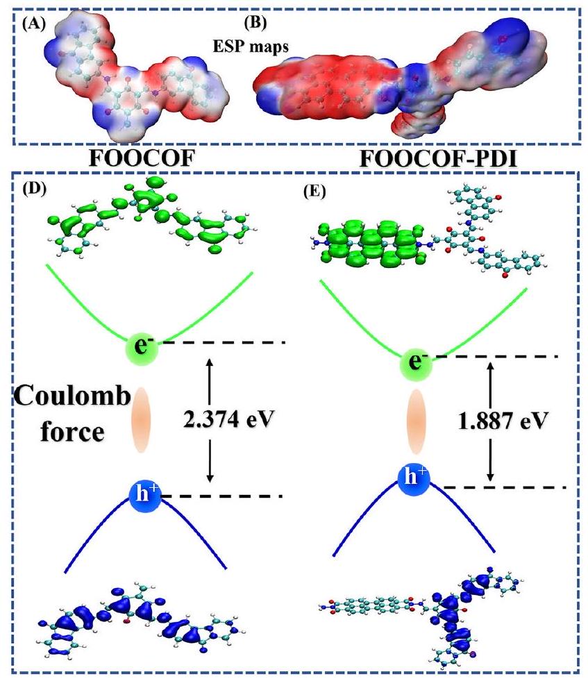 FOOCOF and FOOCOF-PDI molecules was calculated, as depicted in Fig. 5A, B. The calculation of the multipole moment expansion of the molecular ESP revealed the broadest distribution of multipole moments for FOOCOF-PDI DFT, indicating a clear charge separation center. Hence, the single-molecule junction ensures the stable existence of a strong intrinsic electric field , which is crucial for exciton dissociation, carrier separation and migration (Figure S34). Without a single-molecule junction, the electrons involved in the reaction tend to accumulate at the edges of the COF material. They are unable to interact with the reaction solvent immediately. However, after forming a single-molecule junction, it can be observed that the electrons tend to accumulate in the middle of the PDI, as the entire PDI molecule is in direct contact with the solvent, serving as the reaction site (Fig. 5C). Therefore, the formation of the molecular junction promotes the dissociation of excitons and guides free electrons to the interface edge sites, thereby enhancing the separation of charge carriers, reducing the recombination of charge carriers, and improving the efficiency of interfacial reactions. The structures were fully optimized, followed by time-dependent density functional theory (TD-DFT) calculations to gain insights into the exciton generation properties of the COF photocatalyst. The electron-hole distribution in the first excited singlet state (S2) of the two COFs indicates a difference in exciton binding energy ( ) due to localized excitation. The exciton binding energy of FOOCOF-PDI is 1.887 eV , lower than the 2.274 eV of FOOCOF, indicating a weaker exciton effect in FOOCOF, consistent with its photocatalytic activity (Fig. 5D, E). Considering that calculating only fragments would be affected by edge and conjugation effects, we expanded the model and performed calculations on FOOCOF and FOOCOF-PDI (Figure S35). It was found that, under photoexcitation, the calculated results with continuous fragment structures are consistent with the fragment results. This suggests that the exciton effect may be one of the controlling factors in this process. FOOCOF and FOOCOF-PDI mainly absorb peaks composed of transitions from SO to