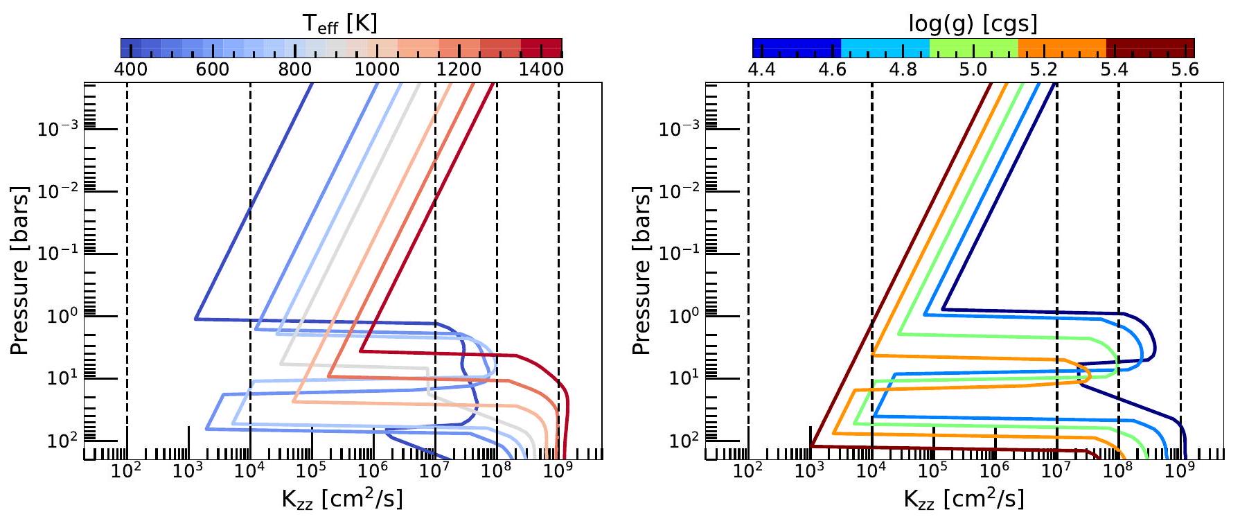 يتطلب الفهم الكامل للخلط الديناميكي الجوي قيودًا على في كل من الأجزاء الحملية والإشعاعية من الغلاف الجوي. حاليًا، في أجواء الأقزام البنية والكواكب الخارجية لا يزال غير مؤكد بأكثر من مليون مرة (لاسي وبيروز 2023؛ موكيرجي وآخرون 2022؛ كاراليدي وآخرون 2021؛ فيليبس وآخرون 2020؛ فورتني وآخرون 2020؛ زاهنل ومارلي 2014؛ هوبيني وبيروز 2007؛ بارمان وآخرون 2015). تُظهر التقديرات النظرية لملفات لسلسلة من أجواء الأقزام البنية مع تغير من موكيرجي وآخرون (2022) في الشكل 1، اللوحة اليسرى. تُظهر اللوحة اليمنى من الشكل 1 اعتماد ملفات النظرية على. تُظهر هذه التقديرات النظرية أن يمكن أن تتغير بأوامر من حيث الحجم بسبب التغيرات في كلا هذين المعاملين. علاوة على ذلك، في نفس الغلاف الجوي، يمكن أن يتغير بعدة أوامر من حيث الحجم اعتمادًا على ما إذا كانت جزء معين من الغلاف الجوي إشعاعي أو حمل حراري. يُرى مثل هذا التغير في عبر المناطق الإشعاعية أو الحملية أيضًا في النماذج النجمية (على سبيل المثال، فارغيس وآخرون 2023). يُظهر الشكل 1 أيضًا أن موقع المناطق الحملية والإشعاعية يمكن أن يكون أيضًا دالة قوية لكل من و.