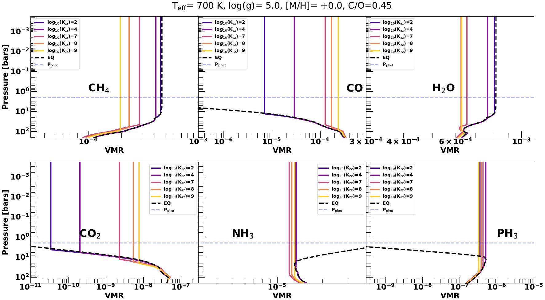 الشكل 2. ملفات نسبة خلط الحجم لـ، و مُعروضة في الألواح الستة لكائن بدرجة حرارة 700 كلفن معمع جو يتكون من مكونات شمسية. تمثل الخطوط الملونة المختلفة نماذج مع اختلافمنإلىتظهر ملفات نسب الخلط من نموذج التوازن الكيميائي لنفس الجسم مع الخطوط المنقطة السوداء. الضغط المتوسط في الطبقة الضوئية للنماذج هوالأشرطة، التي تظهر مع الخط المنقط الأزرق في جميع اللوحات.