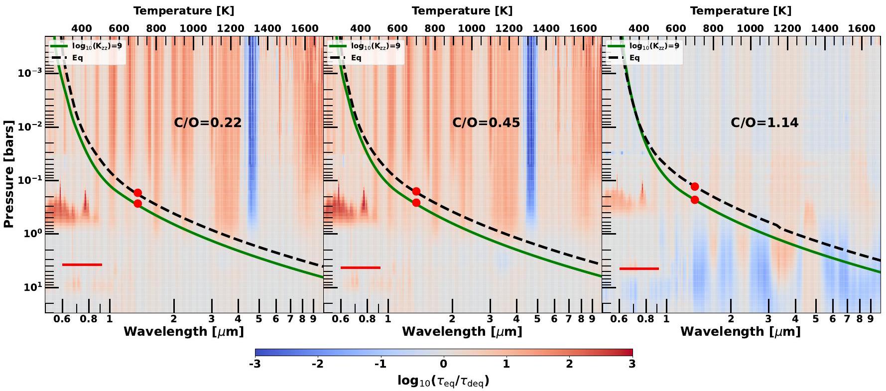 ومع ذلك، عند المعدل الشمسي للمعادن (اللوحة الوسطى)، يكون نموذج التوازن الحراري الكيميائي أكثر تعتيمًا مقارنةً بـنموذج، خاصة فوق 1 بار. وذلك بسبب القيمة العالية لـفي نموذج كيمياء عدم التوازن يسببلتُروى في الغلاف الجوي الأعمق والأكثر حرارة مما يؤدي إلى انخفاضوفرة في الغلاف الجوي العلوي مما يجعل الغلاف الجوي أكثر شفافية منتوازن كيميائي غني الغلاف الجوي. منذيمتص عبر الأشعة تحت الحمراء القريبة، فإن الوفرة المنخفضة للغاز تسمح بتبريد إشعاعي أكثر كفاءة من أعماق الغلاف الجوي.ملف تعريف الـالنموذج بالتالي أبرد بمقدارمن نموذج التوازن الكيميائي عند المعدنية الشمسية. يتم تضخيم نفس التأثير إلى درجة أكبر عندالموضح في اللوحة اليمنى في الشكل 3. هذا يتسبب فيالنموذج ليكون أبرد بحواليمن نموذج التوازن الكيميائي فيالتركيز المعدني الشمسي. ضغوط التوقف لـ، و في الأجواء التي تحتوي على خلط عمودي يتم الإشارة إليها بخطوط أفقية حمراء في جميع الألواح الثلاثة من الشكل 3.