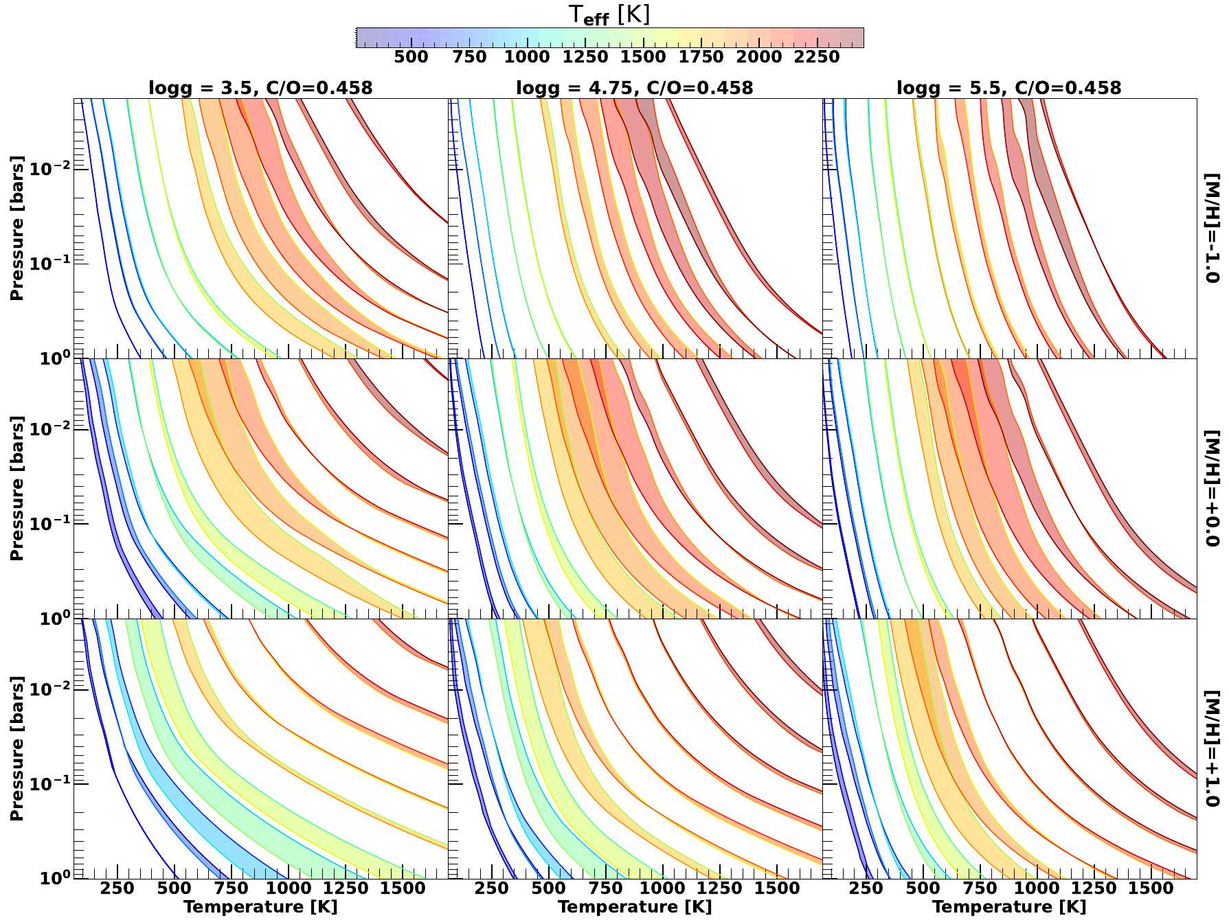 الشكل 5. حساسية الـالملف الشخصي إلىعبر نطاق واسع منتُظهر القيم عند معدلات معدنية جوية مختلفة وجاذبيات مختلفة. كل لوحة تُظهرملفات تعريف لـقيم من500 ك، و300 ك. المنطقة المظللة لـالملفات الشخصية في كليظهر حساسية الـملفات تعريف للاختلاف فيمنإلىأعلىيؤدي إلىالملفات لتكون أبرد من الأدنىالنماذج. الصف العلوي يظهر النماذج معالمعدنية الشمسية للغلاف الجوي بينما تظهر الصفوف الوسطى والسفلية نماذج مع شمسية والمعدنية الجوية الشمسية. الصف الأيسر يعرض النماذج عندبينما تُظهر الصفوف الوسطى واليمنى النماذج في و ، على التوالي. جميع النماذج المعروضة هنا تحتوي على .