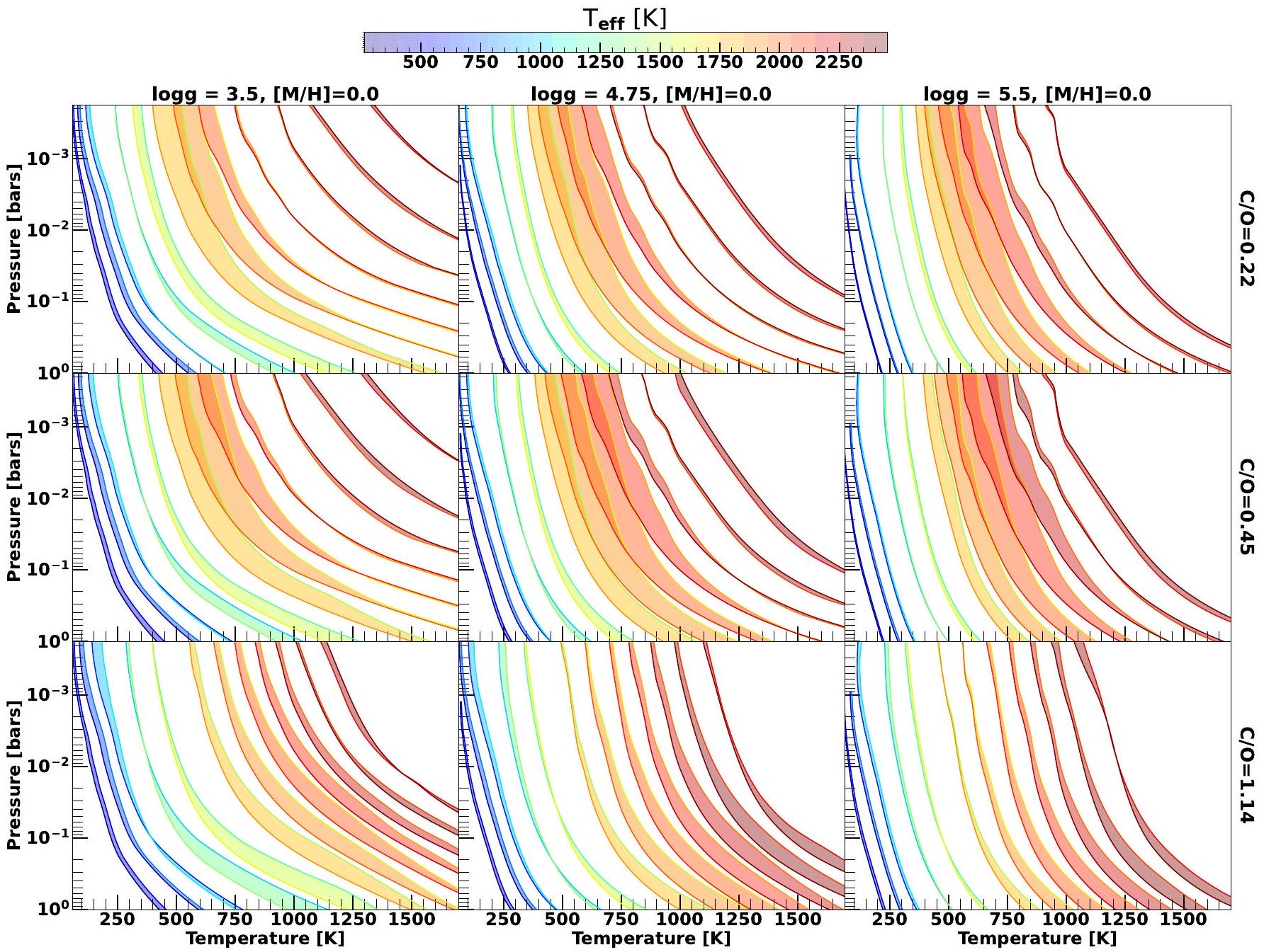 Figure 5. Sensitivity of the profile to across a large range of values at different atmospheric metallicities and gravities are shown. Each panel shows profiles for values of , 500 K , and 300 K . The area shaded for the profiles at each shows the sensitivity of the profiles to variation in from to . Higher causes the profiles to be colder than lower models. The top row shows models with solar atmospheric metallicity while the middle and the bottom rows show models with solar and solar atmospheric metallicity. The left row shows models at while the middle and right rows show models at and , respectively. All models shown here have a .