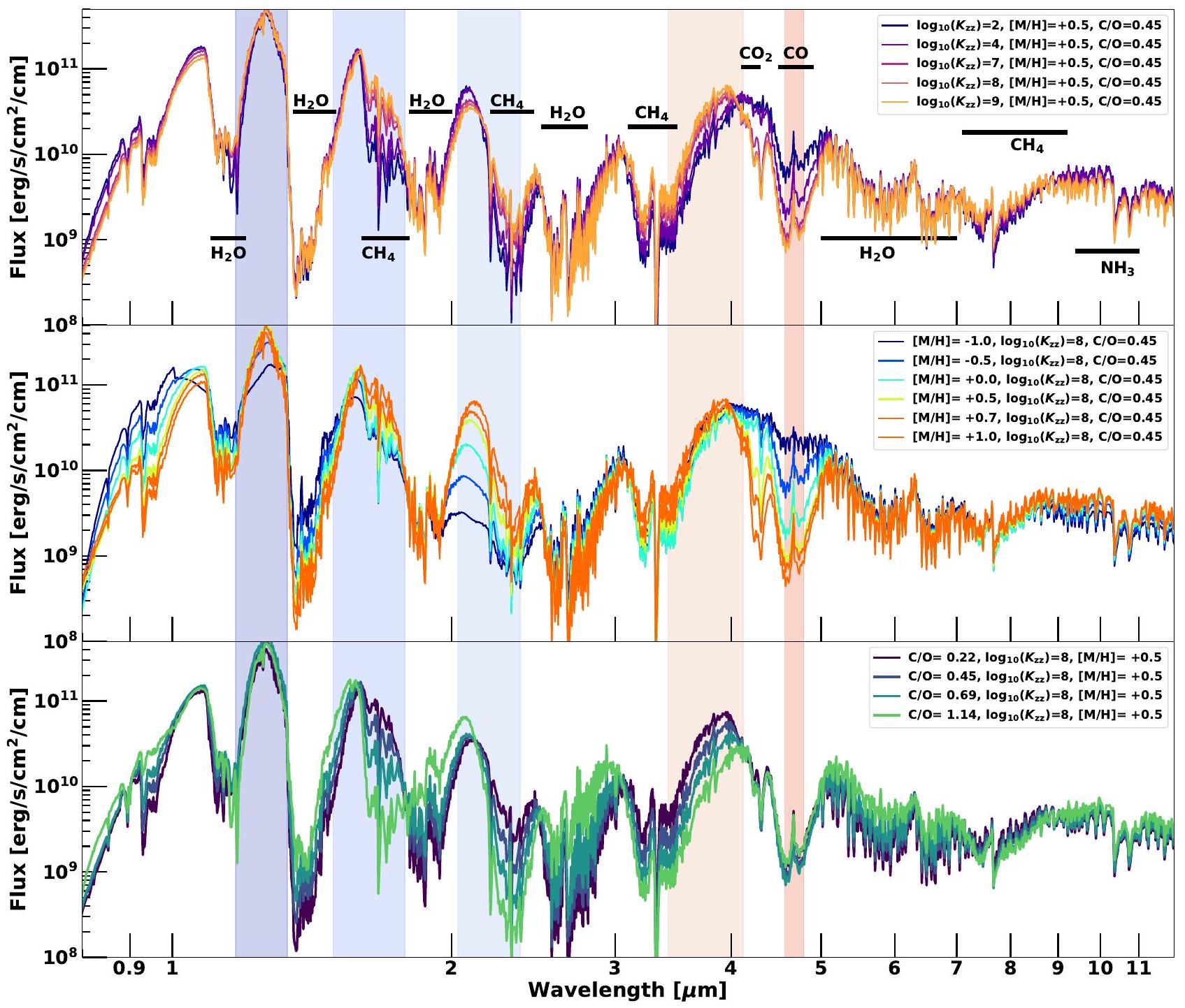 Figure 7. Effect of on the emission spectra between of a 700 K object with is shown in the top panel. The metallicity and the C/O are kept constant across all the models in the top panel. Effect of metallicity on the emission spectra between of a 700 K object with is shown in the middle panel. The and the C/O are kept constant across all the models in the top panel. Effect of on the emission spectra between of a 700 K object with is shown in the bottom panel. The and the metallicity are kept constant across all the models in the top panel. Standard infrared photometric bands like J, , and M are also depicted with the shaded region.