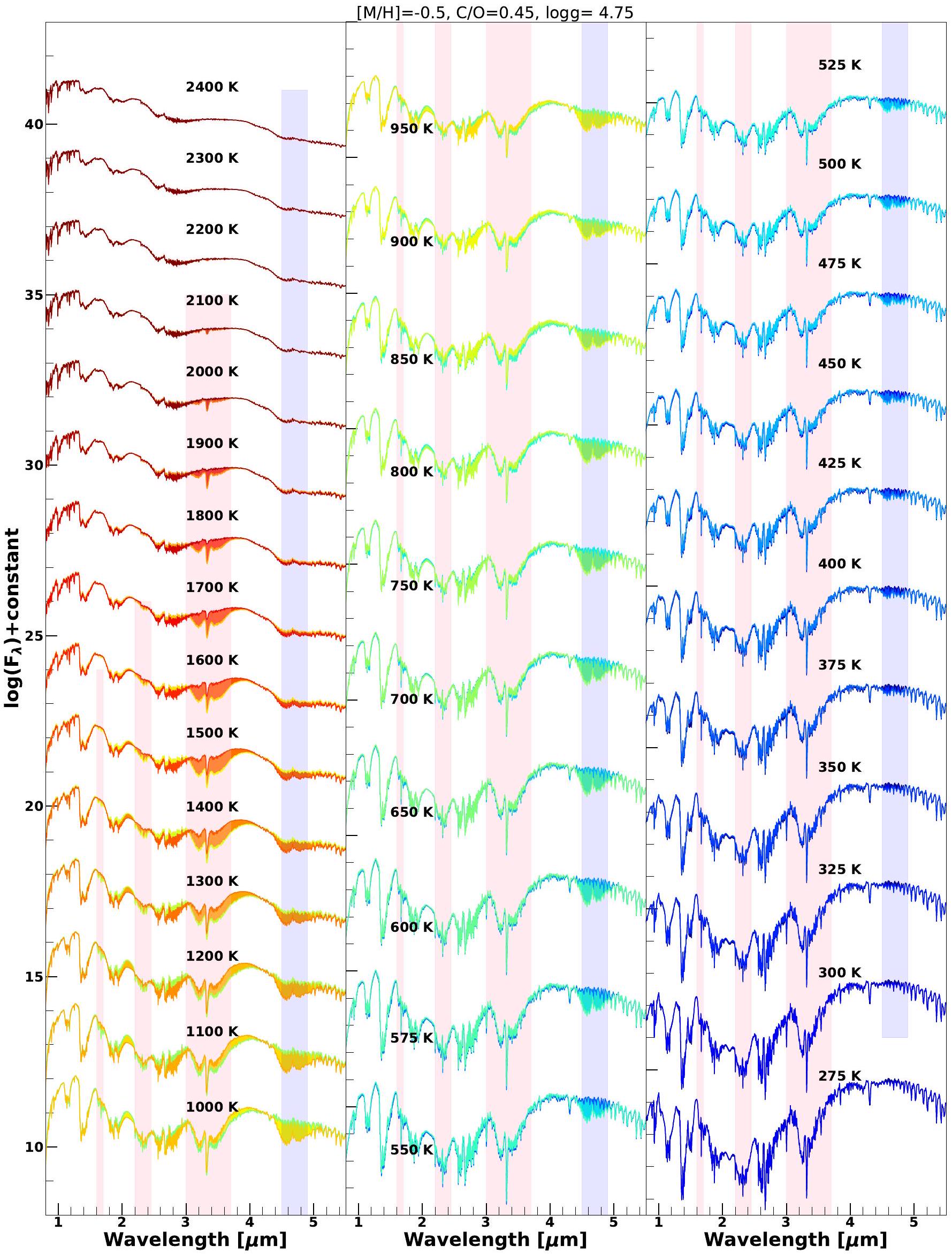 Figure 8 shows the emission spectral sequence from to at a sub-solar atmospheric metallicity of solar and . All the models shown here are for a ( ). For each spectrum shown in Figure 8, the area between the spectral model with the lowest vertical mixing ( ) and the highest vertical mixing ( ) is shaded to depict the variation in spectral features due to changes in at each . Figure 9 shows the same spectral sequences but for super-solar metallicity atmospheres ( solar).