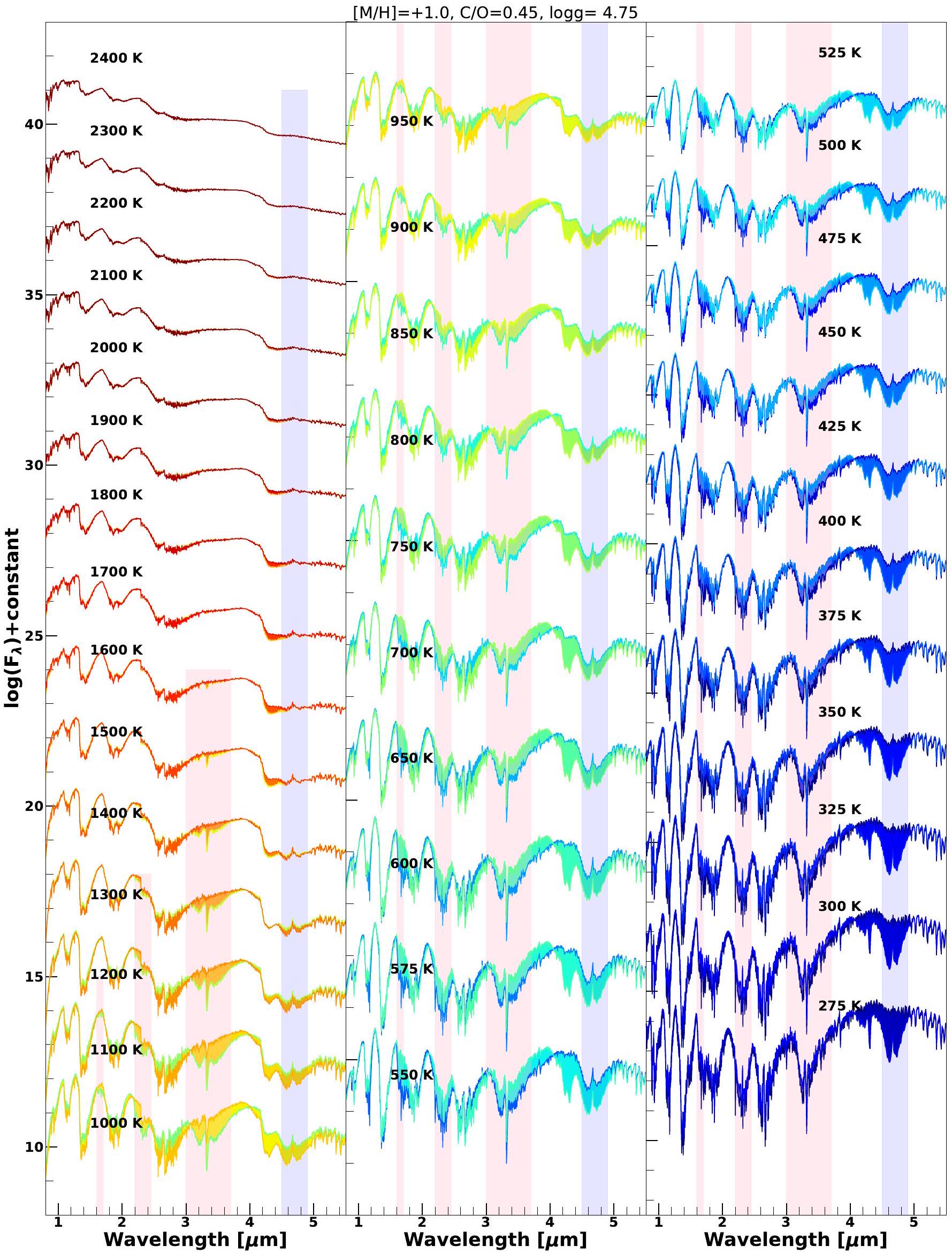 Figure 7 shows the impact of , metallicity, and C/O on the emission spectra of a and object. The top panel shows the variation of the emission spectra with varying from to while the metallicity and the C/O ratio are kept constant at solar and 0.45 , respectively. Large spectral variation due to occurs in the absorption bands between 1.6-1.8 , 2.1-2.5 , and 3-4 . The CO absorption band between also is sensitive to . The bands between 1.10-1.20 , and and the features between
