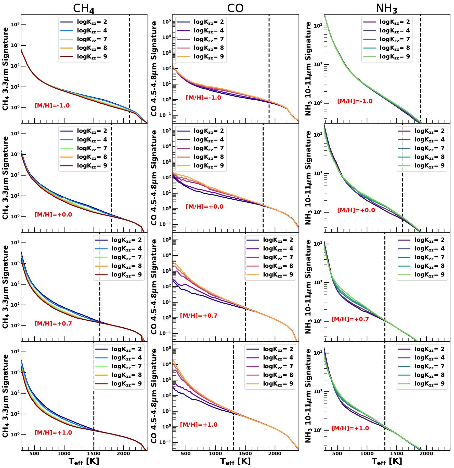 explains the very low found in this work across a range of seen in Figure 15 is a result of quenching in the radiative zone at these . Figure 16 right panel also shows that the mixing in the convective zone needs to be less vigorous than predictions from mixing length theory for the probed with spectra to be very low beyond . However, the Mukherjee et al. (2022) models and our extensions to that grid are applicable only to solar metallicity atmospheres. This work shows that metallicity can become a very important factor in setting these ranges in . The higher SNR data obtained by for a larger sample of T- dwarfs combined with these self-consistent models will help reassess this trend with higher precision on both and .