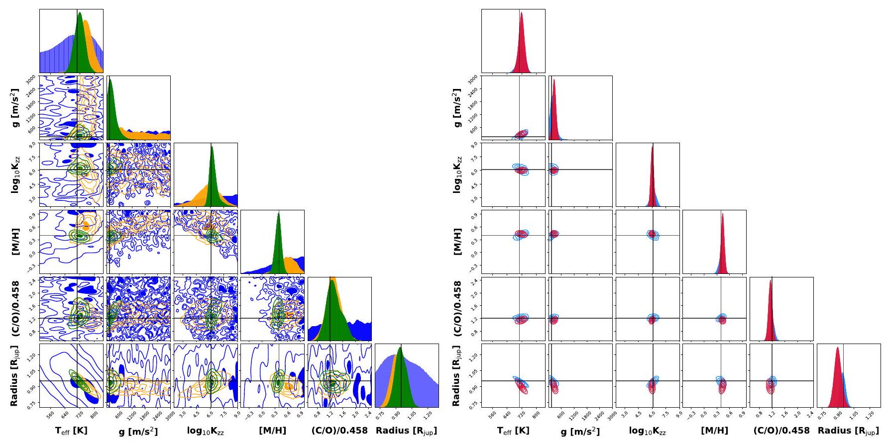 The blue posteriors in the left corner plot show the results of fitting only the (M- band) part of the synthetic spectra. The posteriors on , , and obtained from the M – band show large uncertainties. Most importantly, remains unconstrained along with , and with the M-band data. The orange posteriors overplotted in the left corner plot are the results of fitting the window of the synthetic spectra. The constraints on all the parameters are significantly better with this wavelength range compared to fits of the M- band data only. Unlike the M- band data, this wavelength region can constrain , and . However, like the M- band, this wavelength window can still not constrain . A significant improvement in the constraints on all the parameters is achieved by fitting the data from . These posteriors are shown with green color. This wavelength range allows all the parameters to be constrained, including . The posteriors on all the parameters are both more precise and accurate compared to the Mband (blue) and (green) posteriors.