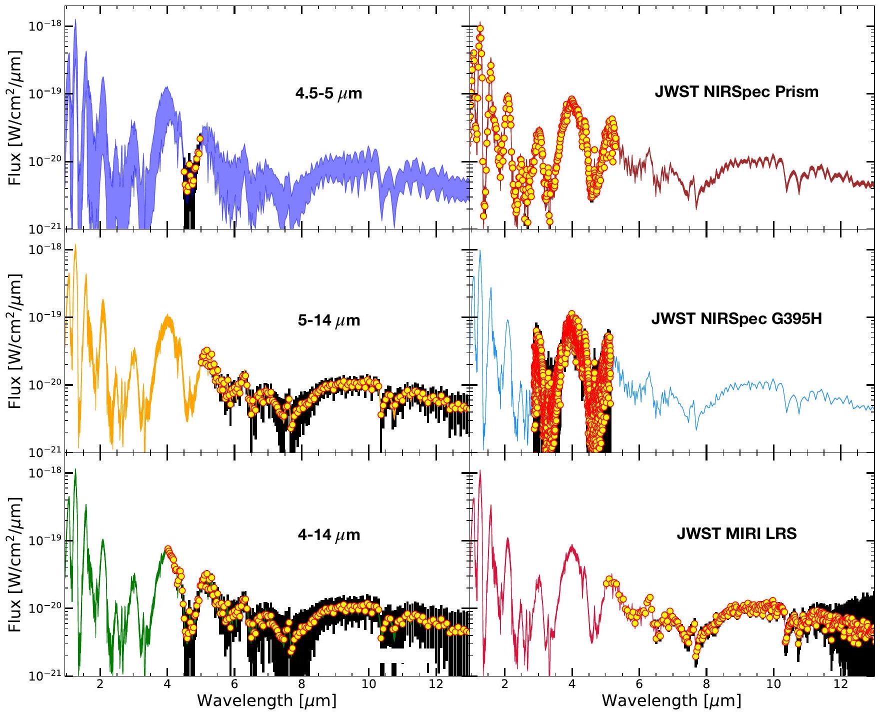 Figure 12. The six panels show the synthetic dataset used for this analysis to obtain the posterior distributions shown in the corner plots in Figure 11. The top left panel shows the synthetic spectra between whereas the middle left panel shows the synthetic data between . The bottom left panel show the region of the synthetic spectra. The top and middle right panels show the synthetic data from NIRSpec Prism and NIRSpec G395H, respectively. The bottom right panel shows the synthetic spectrum from MIRI LRS. Each panel also shows the envelope on the spectra from the fitted posteriors.