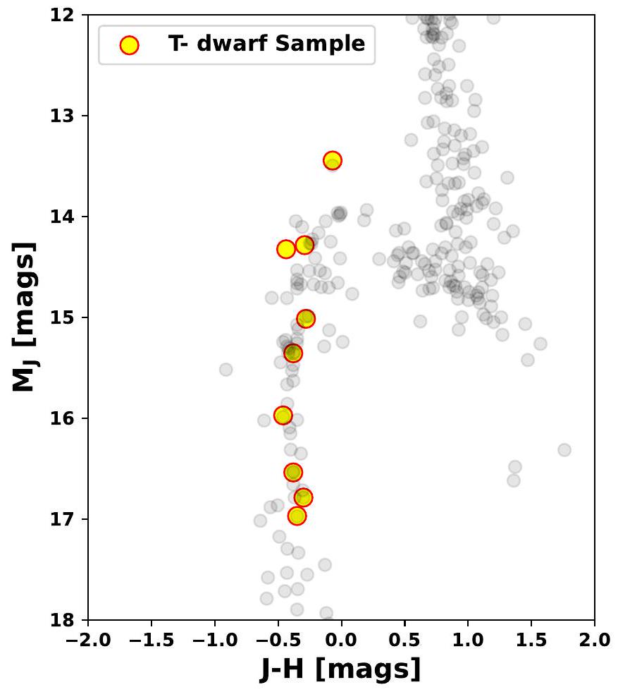 Figure 13. vs. color magnitude diagram of the substellar object population is shown with gray circles. Our T-dwarf sample of 9 objects is shown with yellow circles and it uniformly spans almost the whole of the T – dwarf sequence except the transition objects. All magnitudes shown in this diagram are MKO magnitudes. Data from Best et al. (2020).