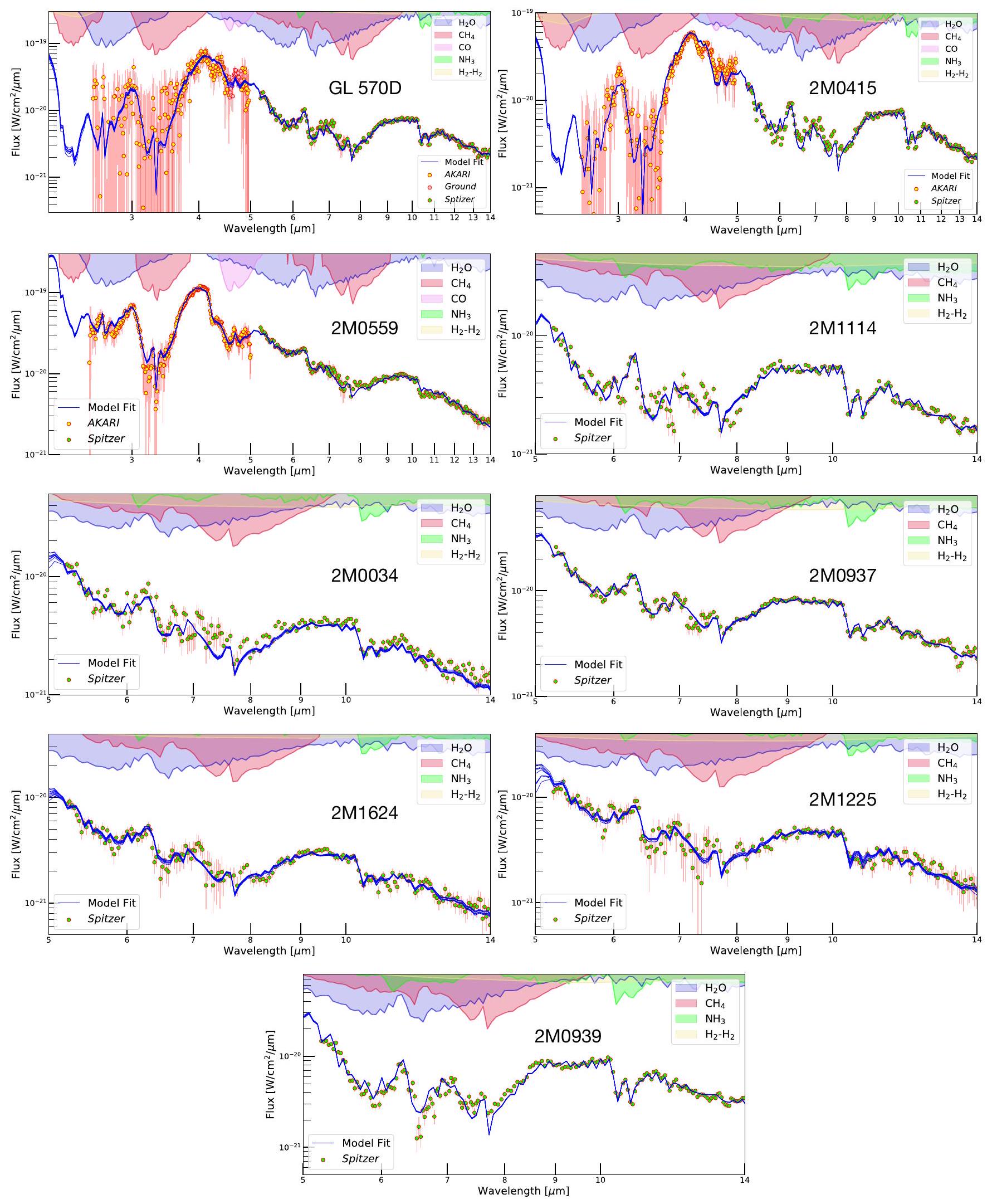 Figures 14 show the observed spectra along with the best-fitting spectral models for each object in each panel. Data from different instruments are shown with different colored markers in each panel. 100 randomly drawn models from the converged posteriors of each object is shown with blue lines in all the panels of Figure 14. To identify the dominant atmospheric gaseous absorbers at each wavelength region, we also show the pressure level as a function of wavelength for the dominant gaseous components in the best-fit atmospheric model of each object. These pressure levels are for illustrative purposes and are shown with an inverted pressure y-axis on the top of each panel. For example, for GL570D in