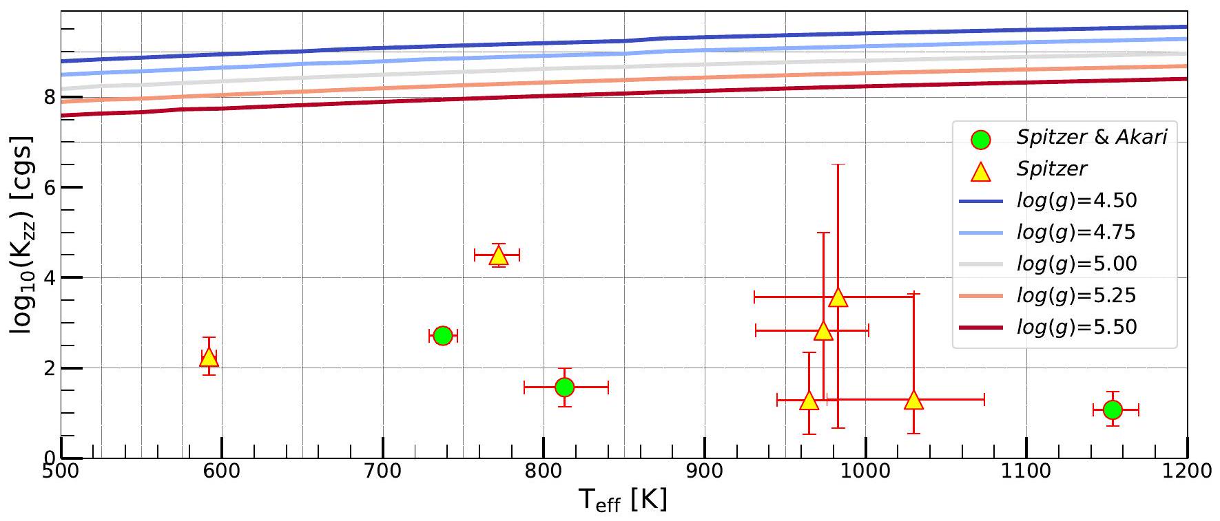 We use these models to fit the or observed AKARI and Spitzer spectra of 9 Tdwarfs sampling the T- type spectral sequence. We constrain the , and of these objects. For objects with between 5501150 K , the values determined are very low, lying in the to range, shown in Figure 15.