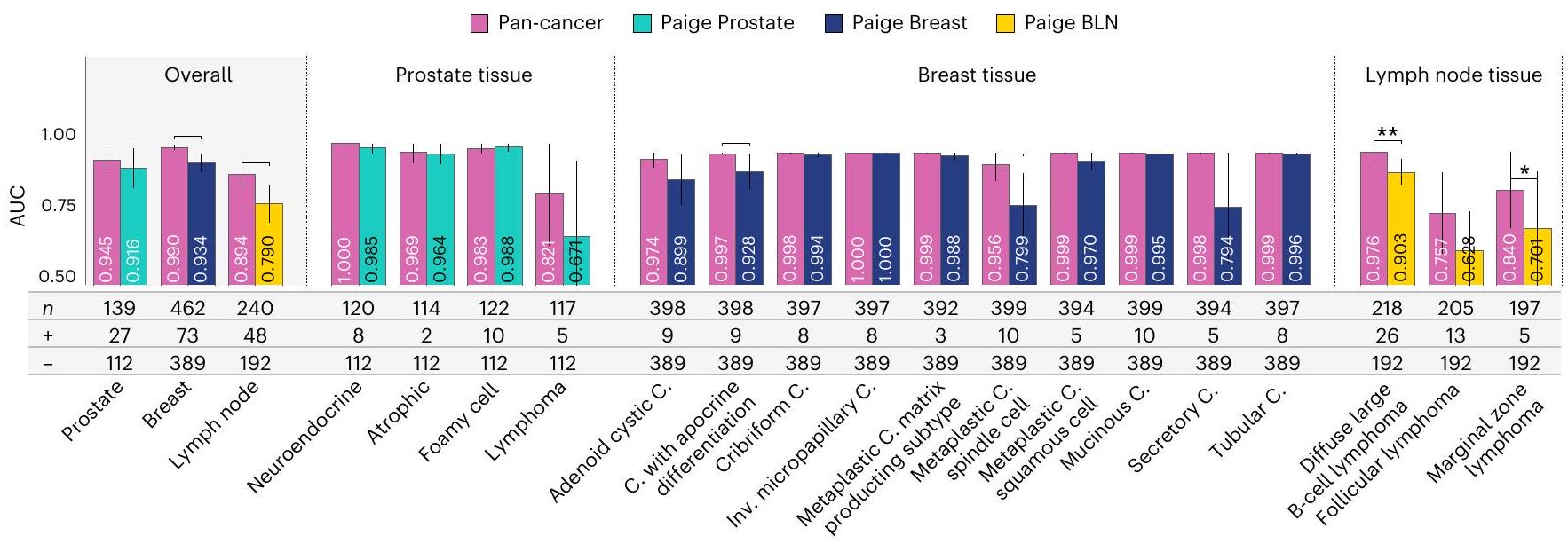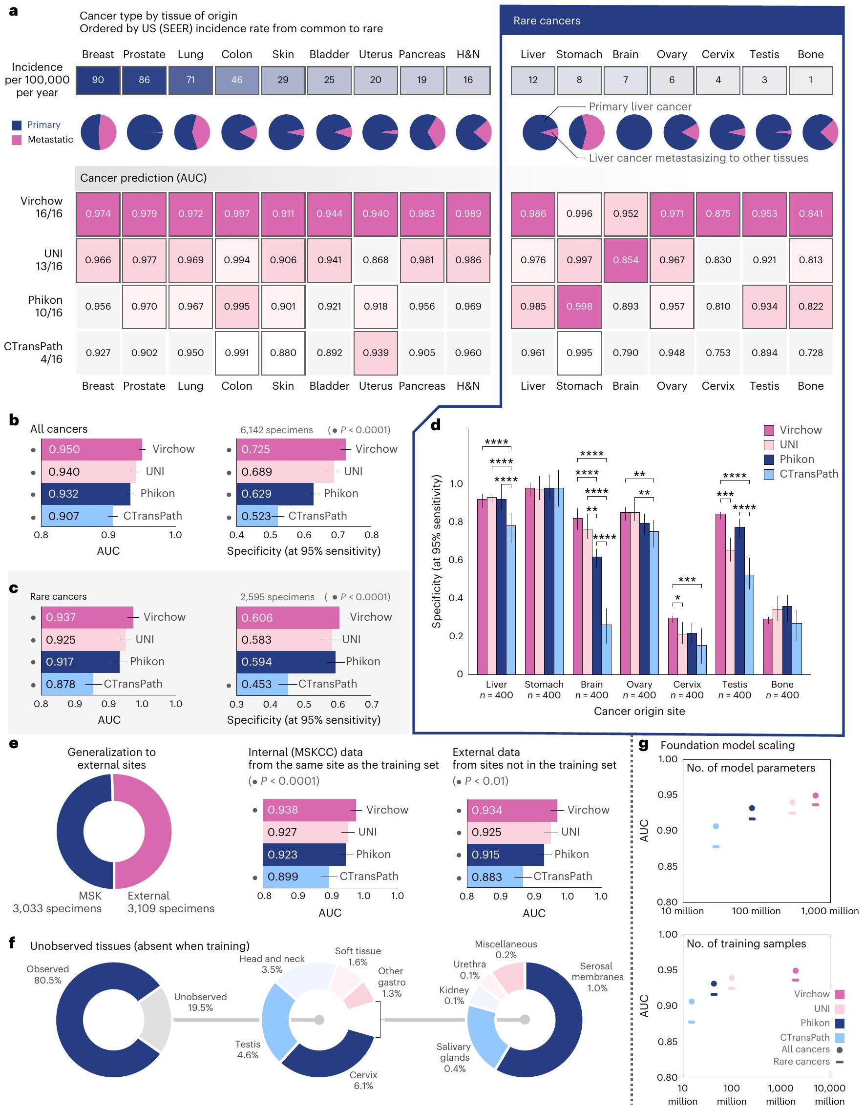 يؤدي نموذج اكتشاف السرطان الشامل القائم على فيرشو، المدرب على السرطانات عبر العديد من الأنسجة، تقريبًا بنفس جودة نماذج المتخصصين السريرية للبروستاتا والثدي وBLN (الشكل 3ج) بينما يتفوق عليها في العديد من المتغيرات النادرة للسرطانات (الشكل 3د). من المهم ملاحظة أن مجموعة تدريب السرطان الشامل لم تستفد من نفس التحسين مثل مجموعات تدريب المنتجات، مثل تعزيز الفئات الفرعية ومراقبة جودة العلامات. علاوة على ذلك، تم تدريب نموذج السرطان الشامل على عدد أقل من العينات المحددة للأنسجة مقارنة بالنماذج السريرية (الشكل 3 والشكل الممتد 4). بشكل ملموس، تم تدريب Paige Prostate على 66,713 كتلة، وتم تدريب Paige Breast على 44,588 عينة، وBLN على 8,150 عينة، بينما تم تدريب السرطان الشامل (باستخدام تضمينات فيرشو) على 35,387 مجموعة من الشرائح (كتل أو عينات) في المجموع، منها 2,829 هي بروستاتا، 1,626 هي ثدي و1,441 هي عقدة لمفاوية. يحقق نموذج السرطان الشامل AUC قدرهو0.971 على البروستاتا والثدي وBLN، على التوالي. يقترب هذا الأداء من أداء النماذج التجارية؛ ومع ذلك، لا يزال يتفوق عليه نموذج Paige Prostate المعتمد من إدارة الغذاء والدواء (0.980 مقابل 0.995 AUC،) ونموذج Paige Breast (0.985 مقابل. من ناحية أخرى، فإنه أفضل إحصائيًا بشكل ملحوظ في اكتشاف النقائل الكبيرة مقارنة بنموذج Paige BLN (0.999 مقابل 0.994 AUC،). علاوة على ذلك، لا يوجد فرق إحصائي ملحوظ () في المقارنات الأخرى لـ BLN أو بعض المقارنات المصنفة لسرطان الثدي (الشكل 3ج).