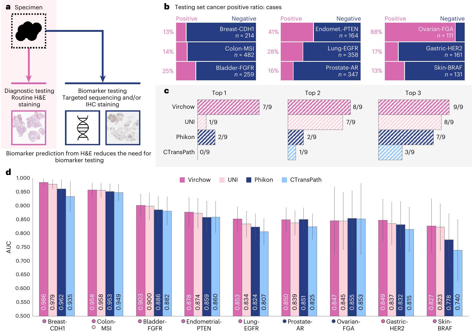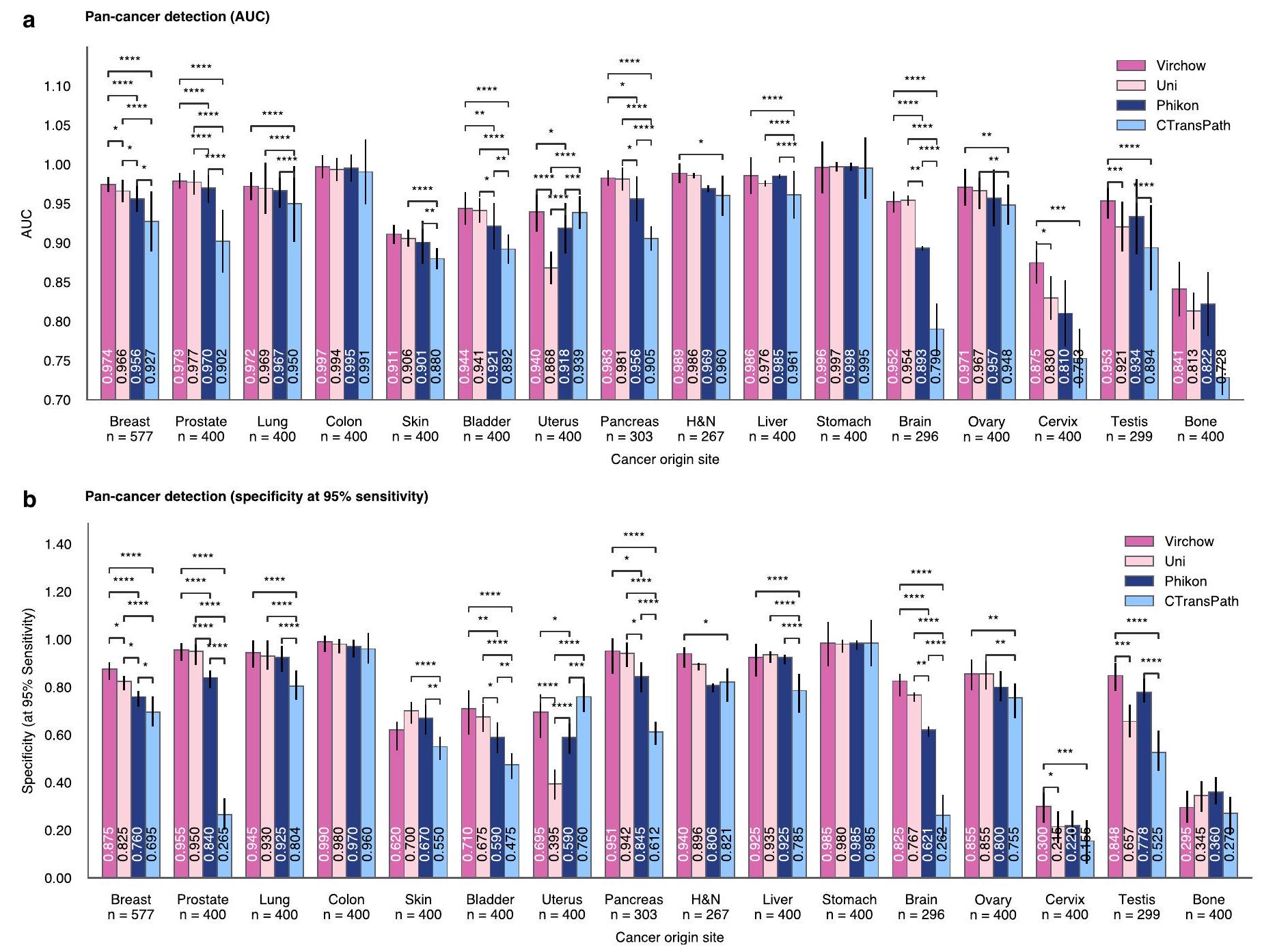 أنتجت تمثيلات فيرشو أفضل أداء في اكتشاف السرطان على جميع أنواع السرطان (الشكل 2أ). حقق اكتشاف السرطان الشامل باستخدام تمثيلات UNI أداءً مشابهًا إحصائيًا ( ) لثمانية من تسعة أنواع شائعة من السرطان وخمسة من سبعة أنواع نادرة من السرطان؛ ومع ذلك، في جميع الحالات باستثناء حالة واحدة، كانت المنطقة المحددة تحت منحنى (مؤشر التشغيل المستلم) (AUC) أقل. بشكل عام، حقق نموذج بان-السرطان AUC قدره 0.950 مع تضمينات فيرشو، و0.940 مع تضمينات UNI، و0.932 مع تضمينات فيكون، و0.907 مع تضمينات CTransPath (الشكل 2b؛ جميعها تختلف بشكل ملحوظ مع انظر الشكل 3 من البيانات الموسعة لمزيد من التفاصيل حول مقاييس AUC والخصوصية، مصنفة حسب نوع السرطان.