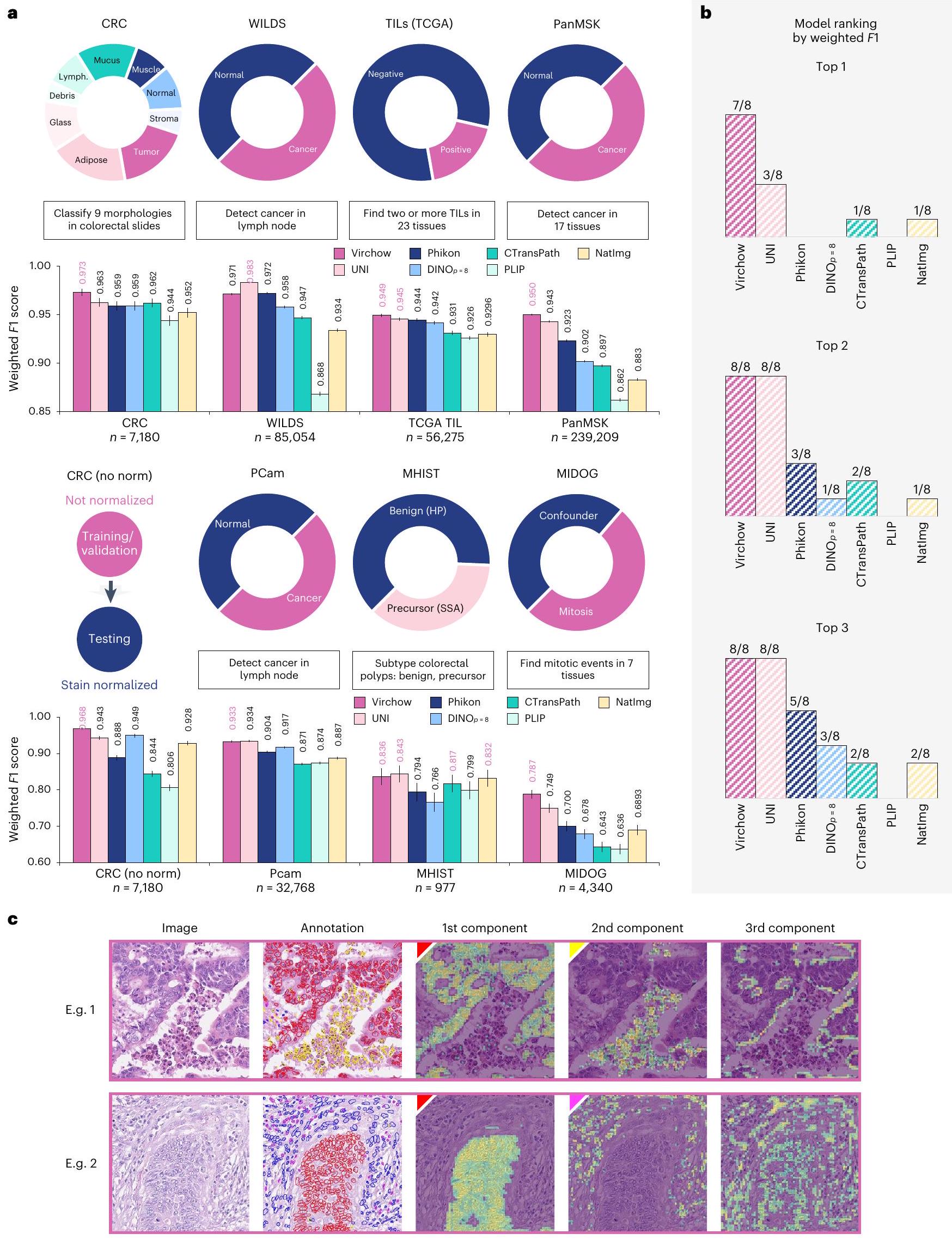 This study did not specifically collect patient data. The retrospective analysis utilized proprietary deidentified digital pathology whole slides and associated metadata were exclusively licensed by Paige.AI, Inc. from MSKCC. Requests for data need to be submitted to Paige AI (https://paige.ai/contact-us/) and evaluated by Paige AI and MSKCC on a case-by-case basis. All requests complying with internal regulations on data privacy and intellectual property will be granted. This study also utilized the following publicly available datasets for downstream benchmarking: CRC (NCT-CRC-HE-100K and NCT-CRC-HE-100K-NONORM, available via Zenodo at https://zenodo.org/records/1214456 (ref. 77)), WILDS (Camelyon17; https://wilds.stanford.edu/get_started), PCam (https://github.com/basveeling/pcam),MHIST(https://bmirds.github. io/MHIST), TCGA TIL (available via Zenodo at https://zenodo.org/ records/6604094 (ref. 71)), MIDOG (https://midog.deepmicroscopy. org/download-dataset/) and TCGA CRC-MSI (available via Zenodo at https://zenodo.org/records/3832231 (ref.76)).